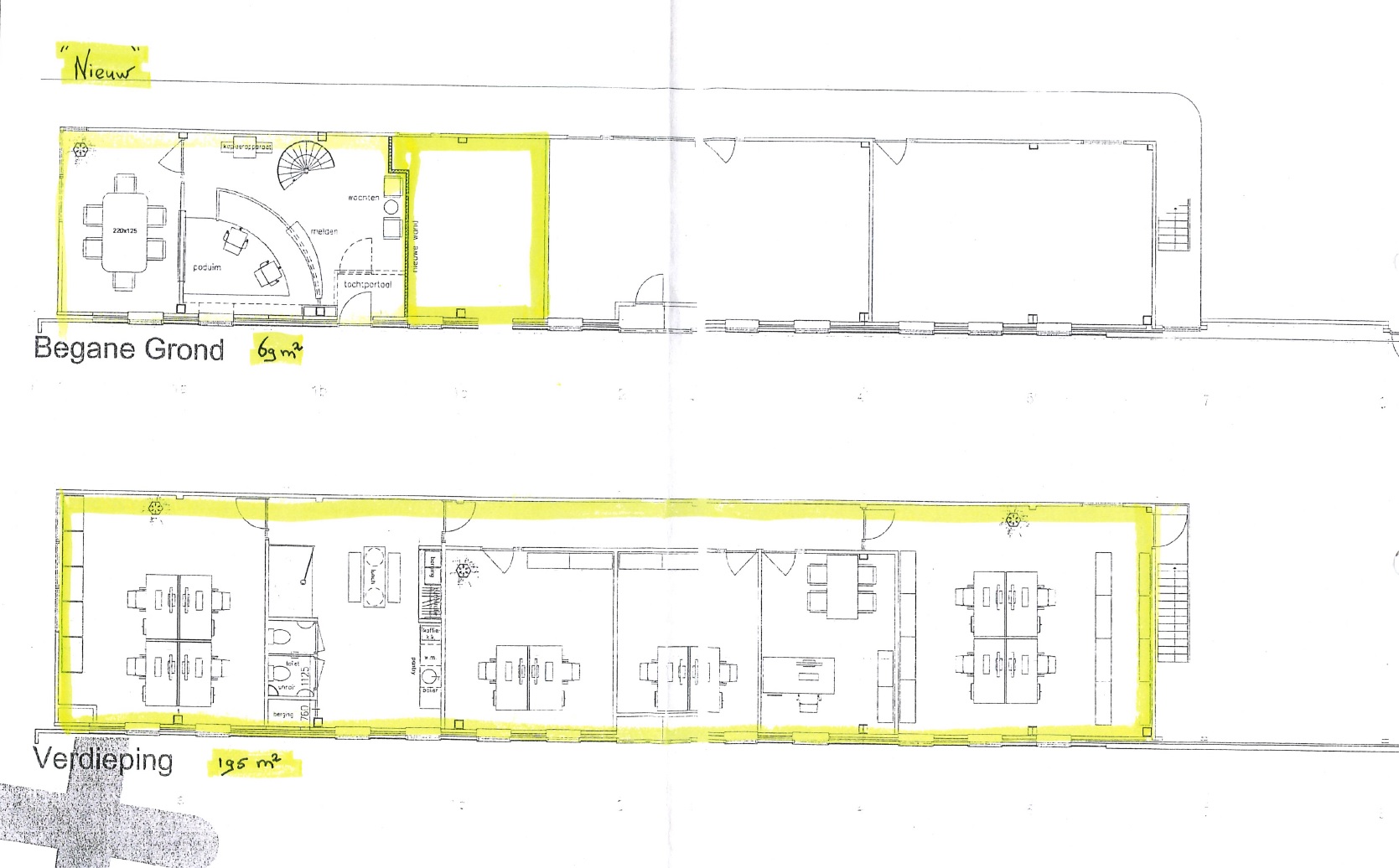 Eerste verd: vier kantoren, toiletgroep met douche, kitschnetten.