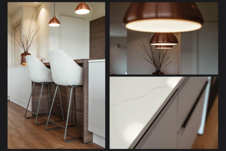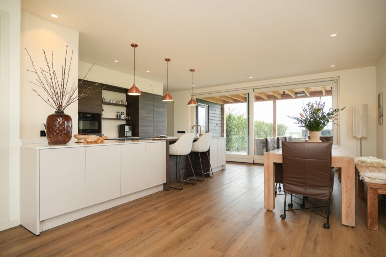 Binnen voel je direct de serene sfeer. De zorgvuldig gekozen materialen en neutrale tinten zorgen voor een rustige, luxe basis. Alles klopt — van de indeling tot de lichtinval. De living staat in halfopen verbinding met de eetkamer en woonkeuken, waardoor de ruimtes op een natuurlijke manier in elkaar overlopen. Het resultaat is een open leefomgeving met een warme uitstraling. De grote raampartijen halen het buitenleven naar binnen en bieden vanuit vrijwel iedere leefruimte een panoramisch uitzicht over het groen. De woonkeuken vormt het stijlvolle hart van de woning en staat via een royale schuifpui in directe verbinding met de veranda, een volwaardige buitenkamer waar je in alle seizoenen beschut en comfortabel kunt genieten. Daarnaast beschikt de woning over een inpandig bereikbare garage van circa 30 m², voorzien van vloerverwarming en uitgevoerd met dezelfde hoogwaardige vloerafwerking als de begane grond — een ruimte die daardoor naadloos aansluit bij het wooncomfort van het huis.
