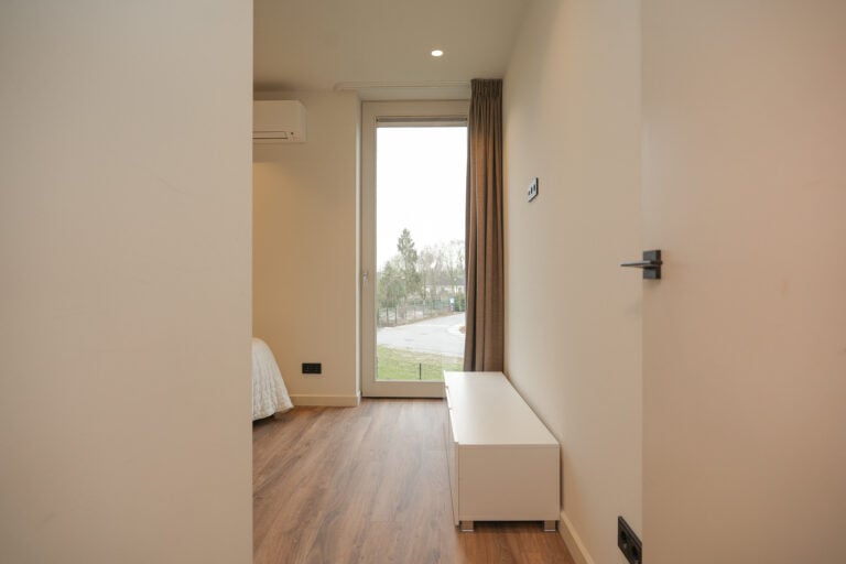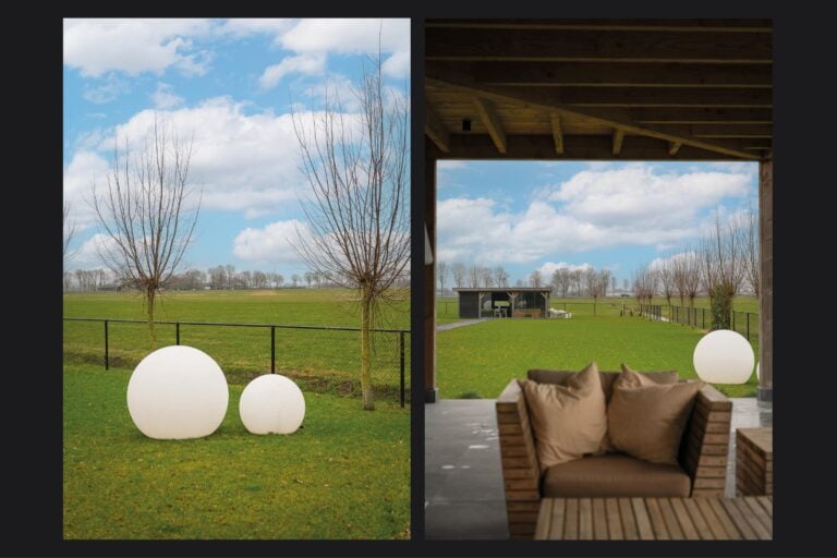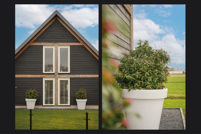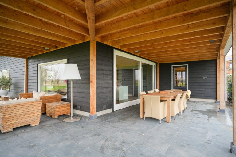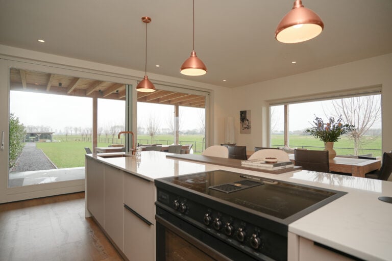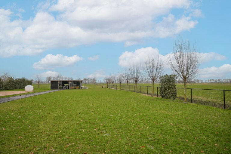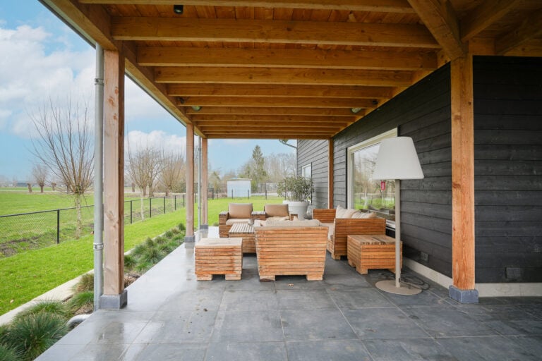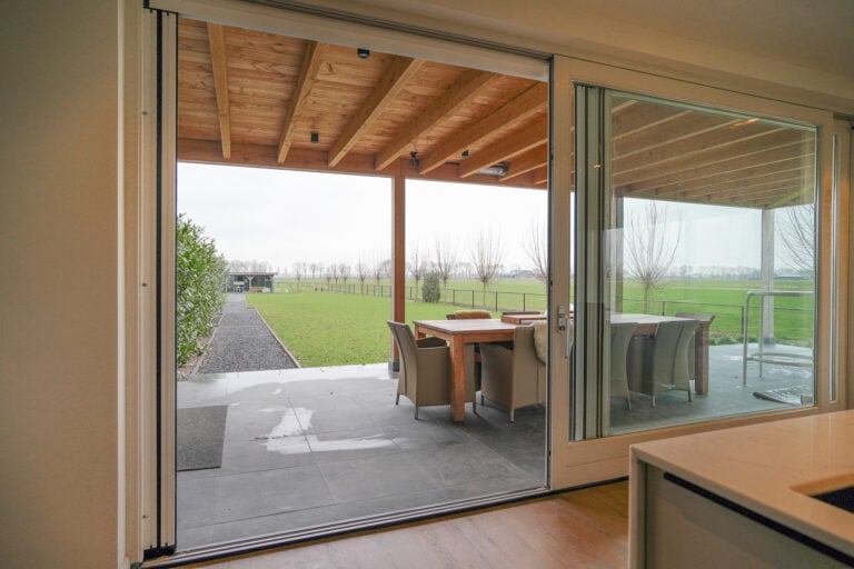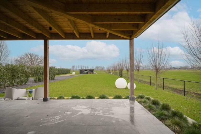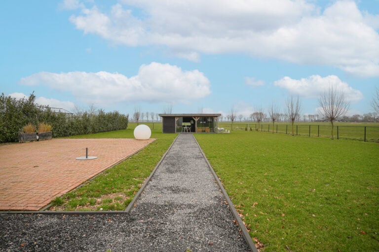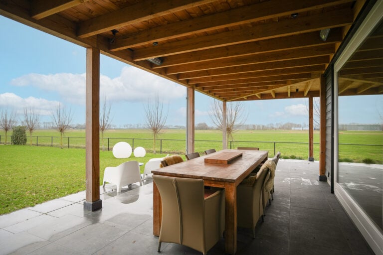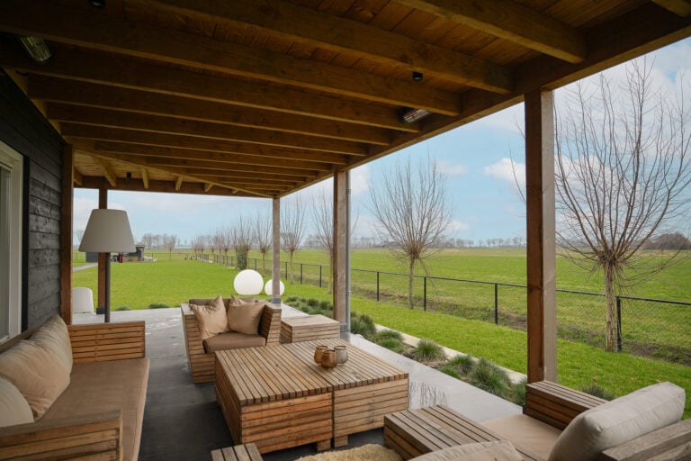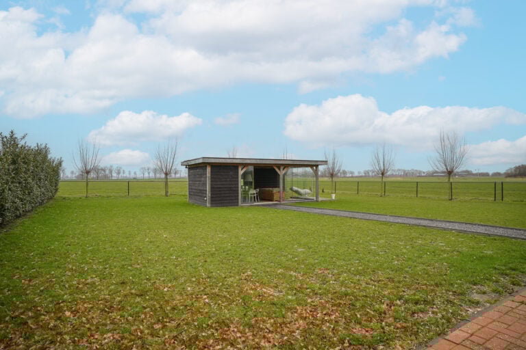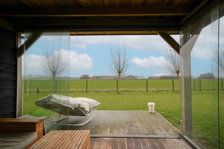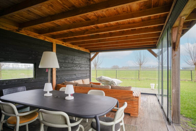 En dan is er nog een extra element: achter in de tuin bevindt zich een stijlvolle, vrijstaande buitenkamer met glazen schuifwanden. Een beschutte lounge- en eetplek met panoramisch uitzicht over de landerijen. Hier ervaar je het buitenleven in alle rust en privacy — van lange zomeravonden tot sfeervolle herfstdagen.