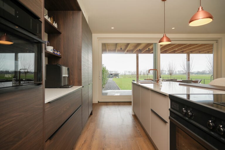 De keuken is ontworpen met oog voor zowel esthetiek als functionaliteit. Een stijlvolle wandkast met geïntegreerde koffienis vormt een elegant geheel met het vrijstaande kook- en spoeleiland. Hier komen koken en samenzijn moeiteloos samen. De hoogwaardige inbouwapparatuur bestaat onder andere uit een extra groot Bertazzoni fornuis met inductiekookplaat met geïntegreerde afzuiging, (stoom)oven, koelkast, vriezer, vaatwasser en Quooker. Via de royale schuifpui loopt de woonkeuken naadloos over in de veranda — een verlengstuk van de leefruimte waar binnen en buiten op natuurlijke wijze in elkaar overvloeien. Aan de voorzijde van de woning bevindt zich de ruime woonkamer. Dankzij de grote raampartijen geniet je hier van een prettige lichtinval en vrij uitzicht over de omgeving. Een apart portaal met trapopgang zorgt voor een rustige overgang naar de eerste verdieping.