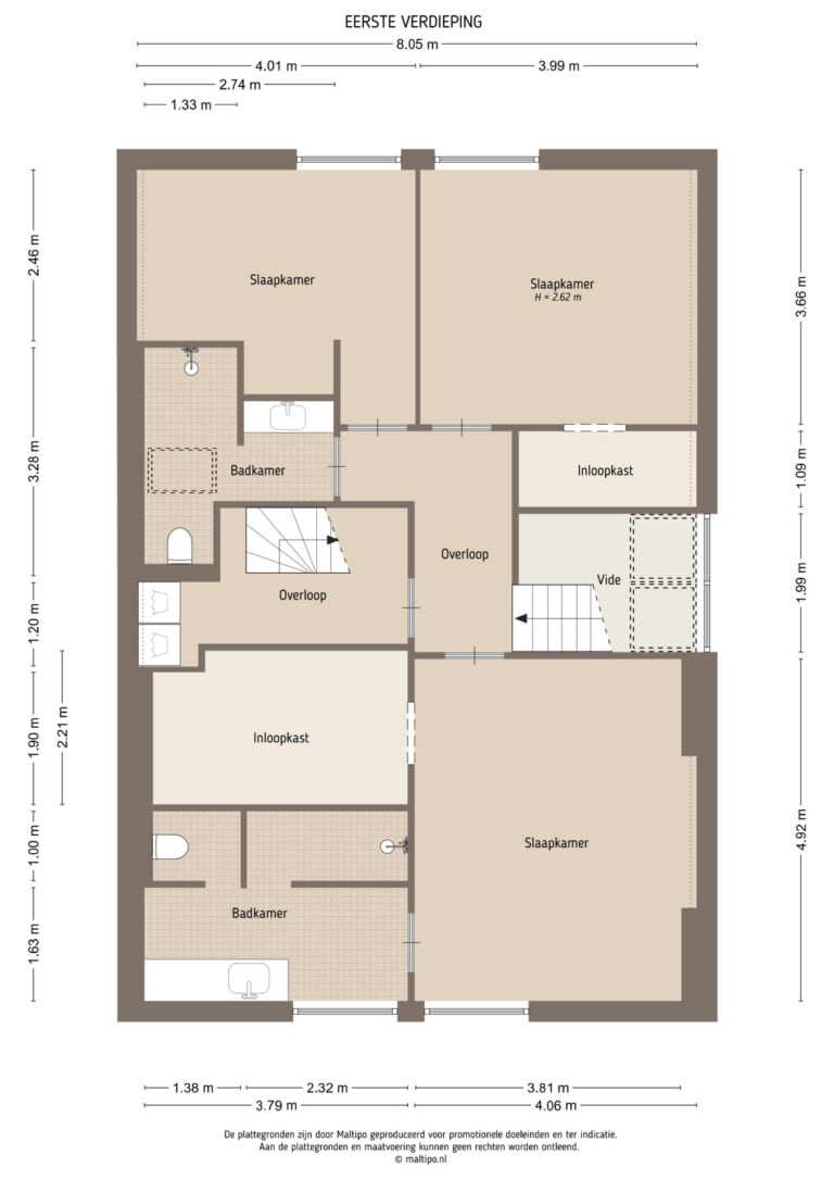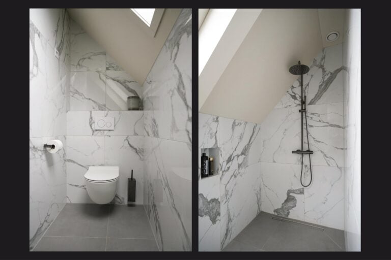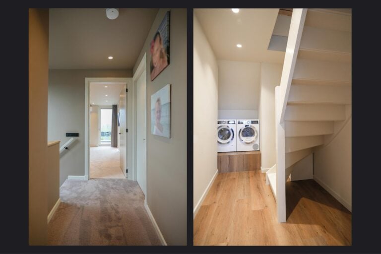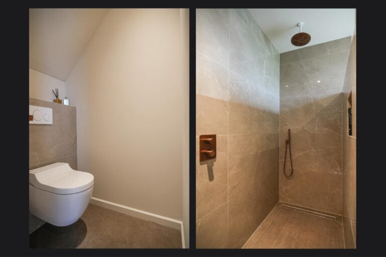 De tweede badkamer is modern en compleet uitgevoerd met een inloopdouche, wandcloset met douchefunctie, badkamermeubel en comfortabele vloerverwarming. Via de overloop bereik je tevens een praktische, separate ruimte met aansluitingen voor wasmachine en droger. Vanuit hier leidt de trap naar de zolderverdieping.
