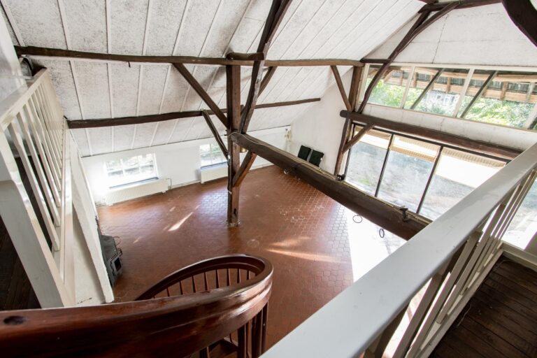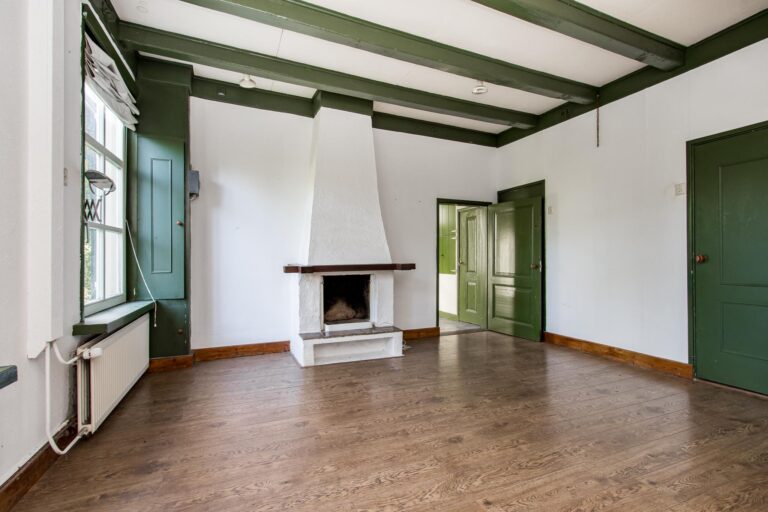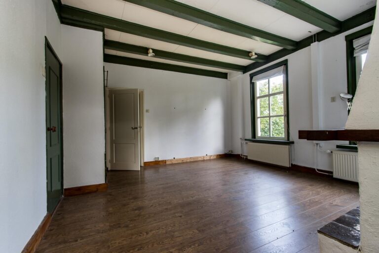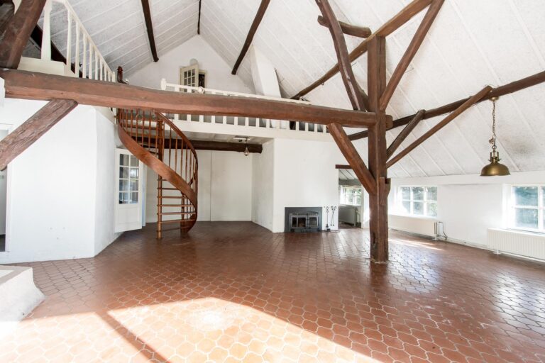 Binnen stap je een wereld van ruimte en karakter in. De enorme woonkamer van ca. 70 m² ademt sfeer door de hoge nok en de authentieke spanten die in het zicht zijn gelaten. De open haard maakt het helemaal af: hier kun je je avonden in alle rust doorbrengen. Vanuit de woonkamer stap je zo de zijtuin in via de openslaande tuindeuren.