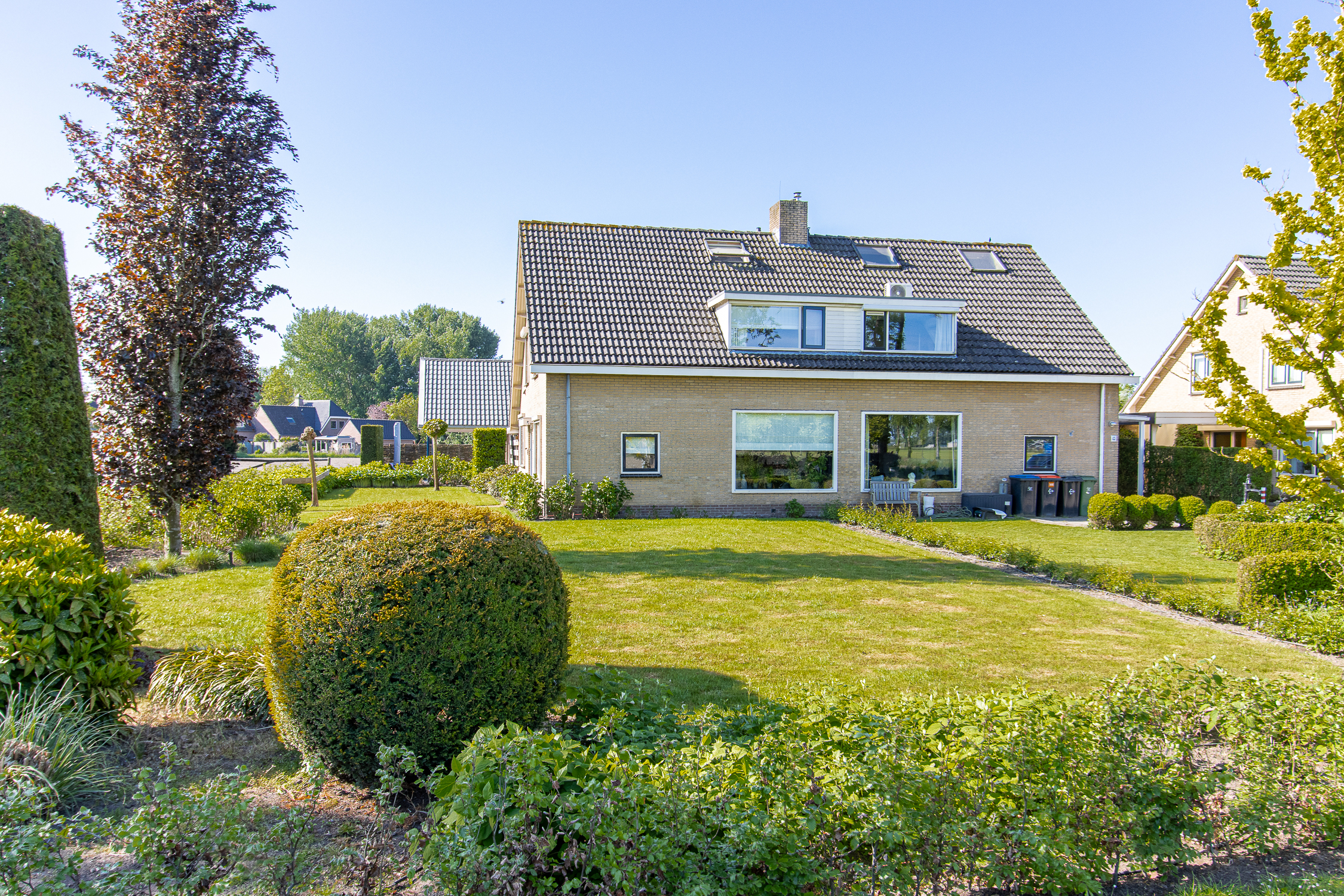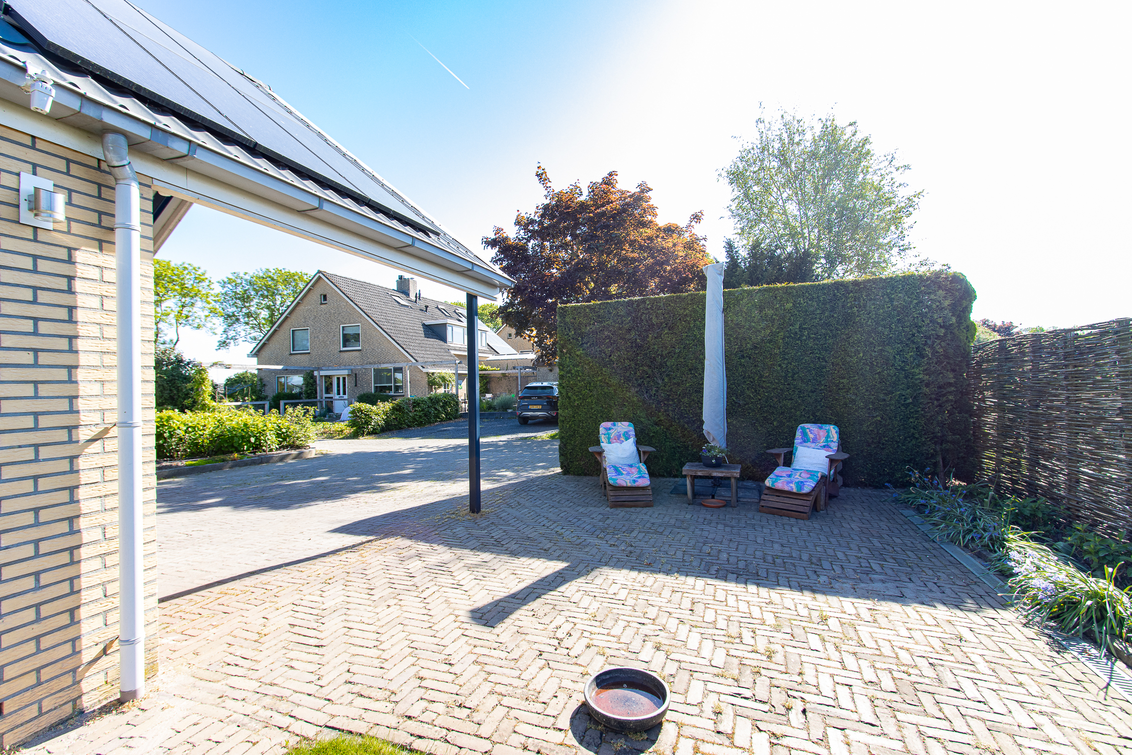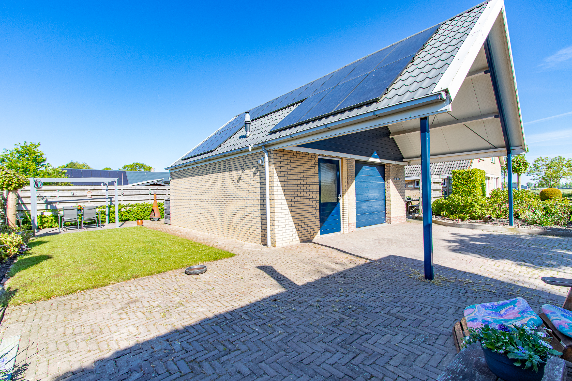 De zonnige achtertuin is gelegen op het zuiden en is een heerlijke plek om van het buitenleven te genieten. De vrijstaande garage met carport is voorzien van vloerverwarming, een toilet, witgoedaansluiting, 380V aansluiting en veel opbergruimte op de zolder. De eigen oprit maakt het plaatje compleet. Aan de voorzijde zorgt de diepe voortuin voor een verzorgde uitstraling dankzij een strak gazon en nette plantenborders.