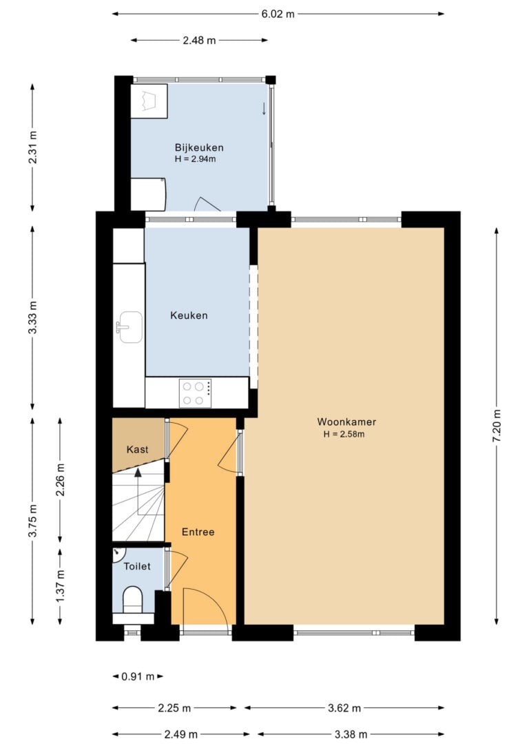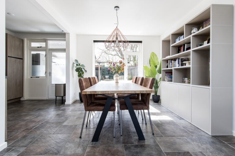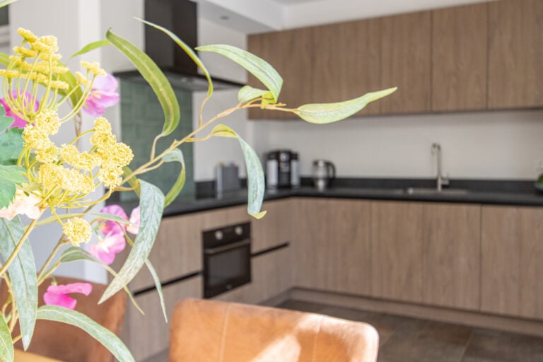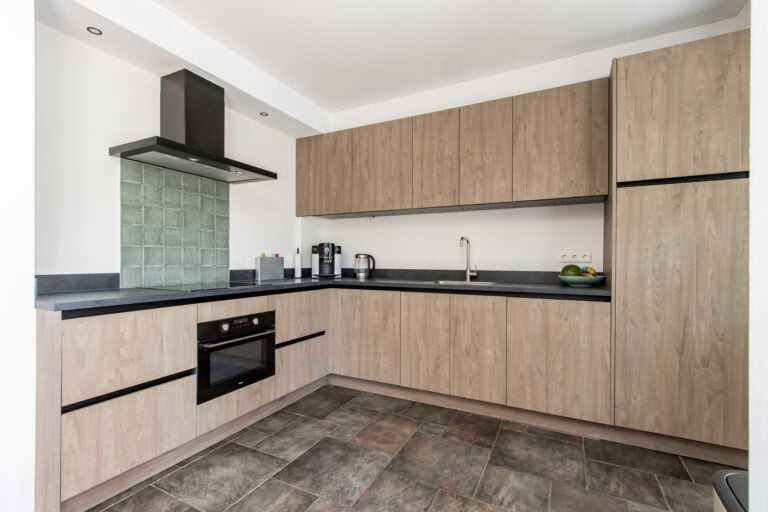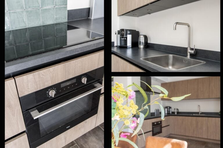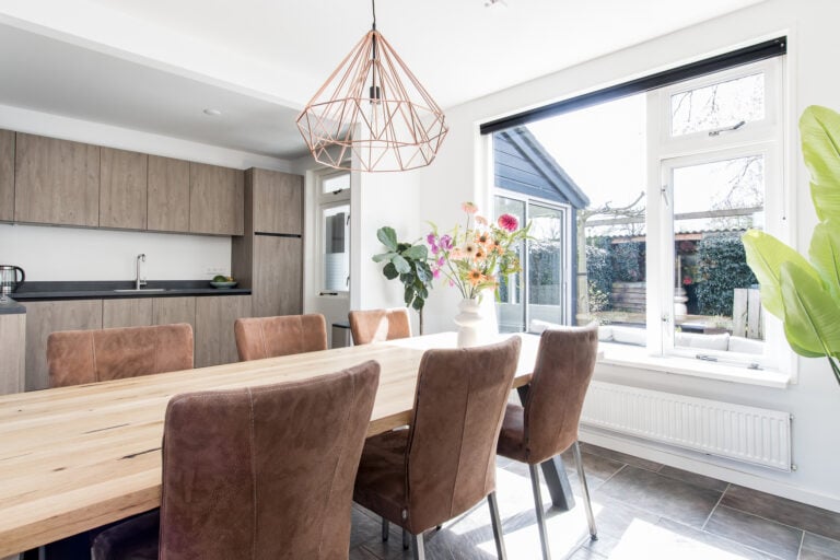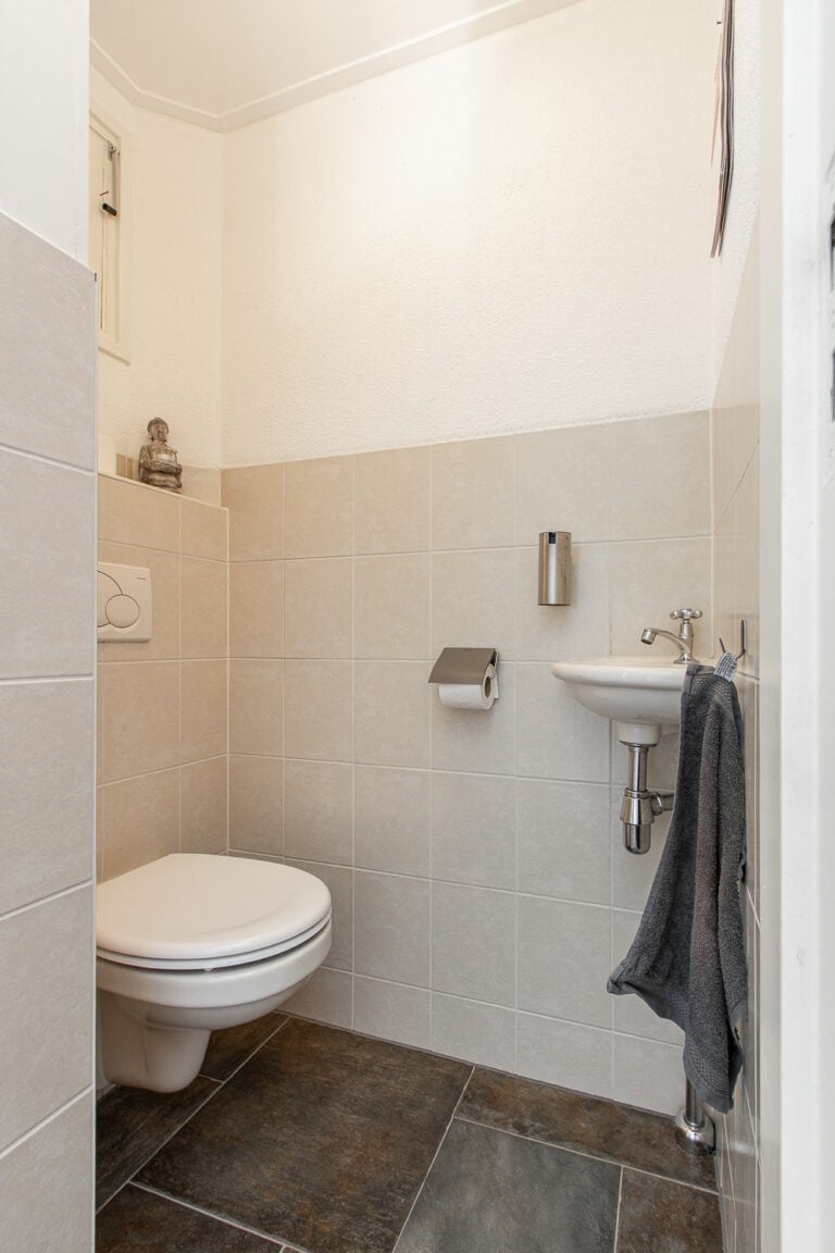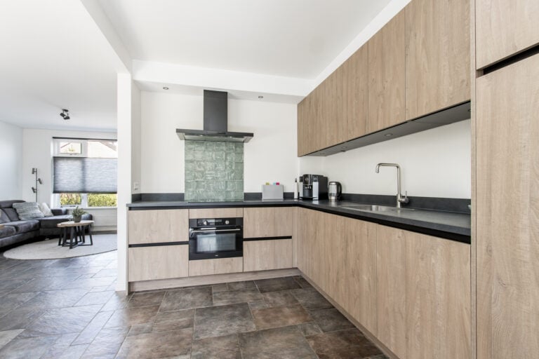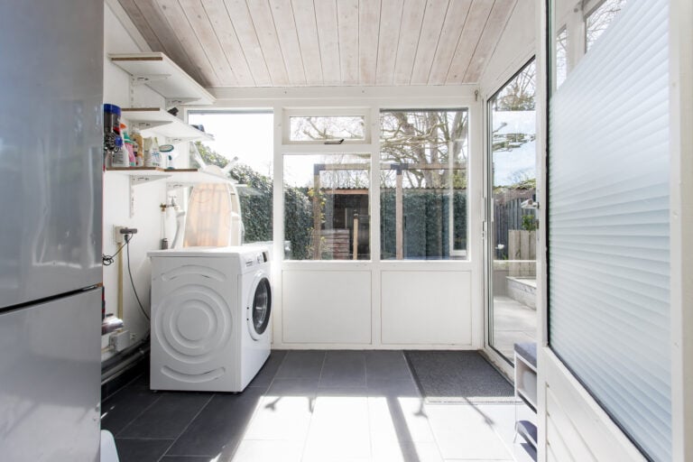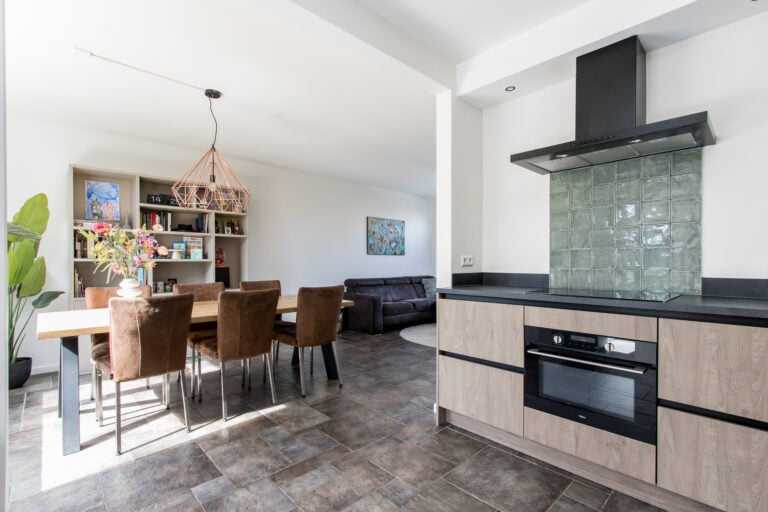 Indeling woning: de entree geeft toegang tot de hal met garderobe, meterkast, toiletruimte, trapkast en trapopgang naar de eerste verdieping. Vanuit de hal stap je de lichte doorzonwoonkamer binnen met aan de achterzijde de moderne open keuken die is voorzien van diverse inbouwapparatuur, waaronder een inductie koopplaat, afzuigkap, vaatwasser, combi-oven/ magnetron en koelkast. Aangrenzend bevindt zich een handige bijkeuken met aansluitingen voor de wasmachine.