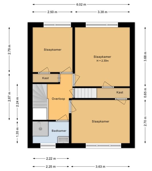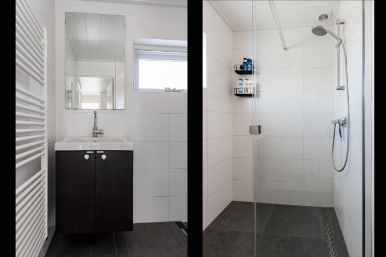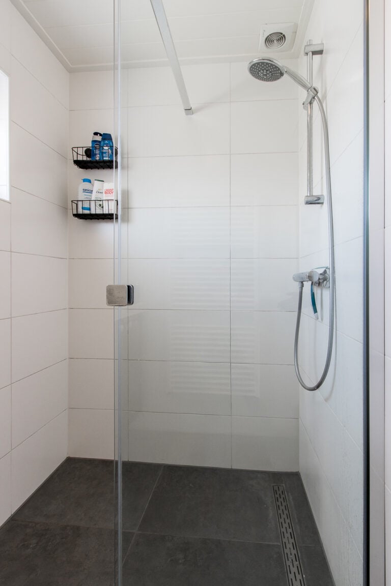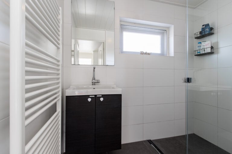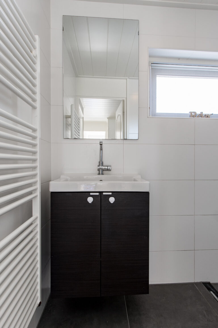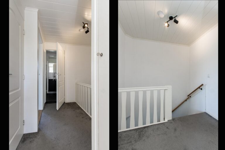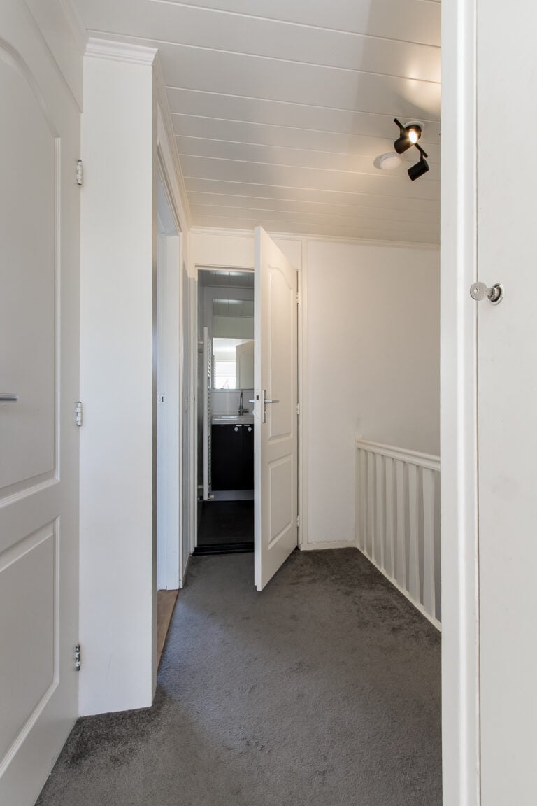 Eerste verdieping: de overloop met vaste kast geeft toegang tot 3 slaapkamers en een nette badkamer met inloopdouche en wastafelmeubel.