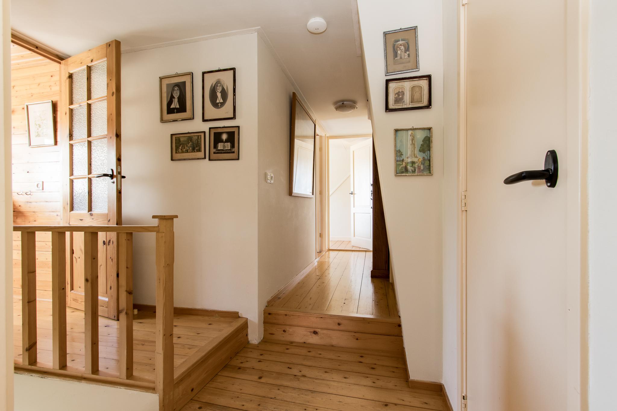 Eerste verdieping: de overloop leidt naar drie slaapkamers, een aantal vaste kastruimte en toiletruimte met wastafel. De vierde slaapkamer is toegankelijk via één van de andere slaapkamers. Door het weghalen van het wandje tussen de derde en vierde slaapkamer ontstaat er één grote (slaap)kamer.