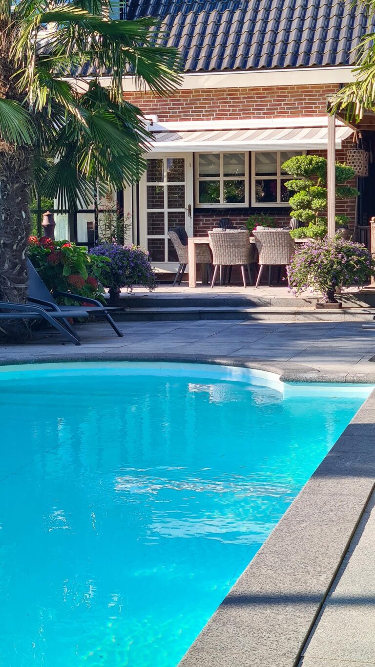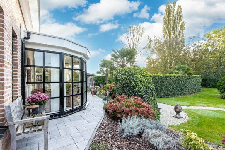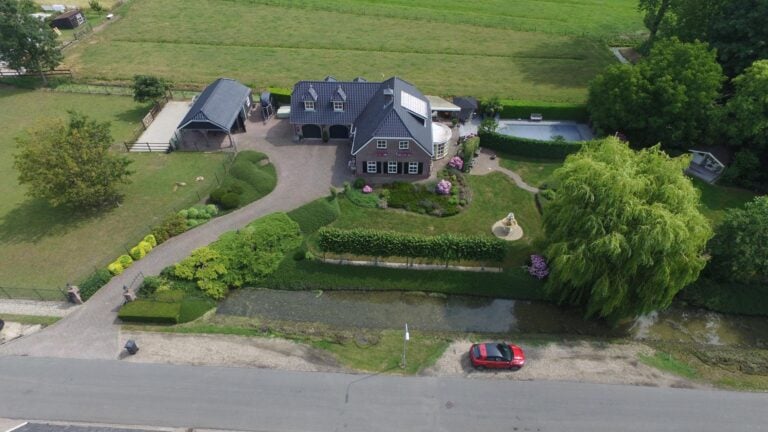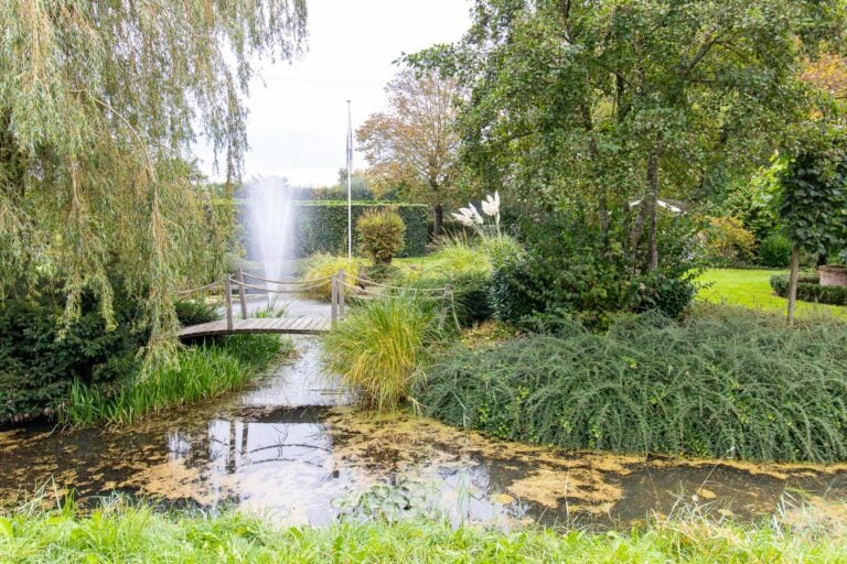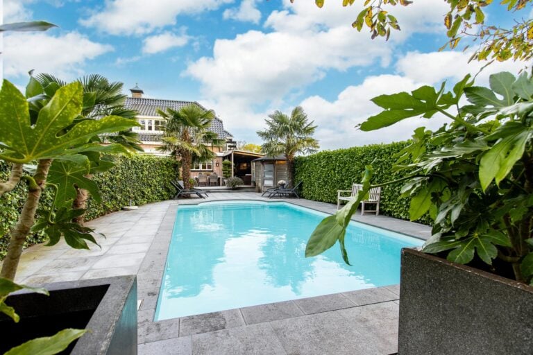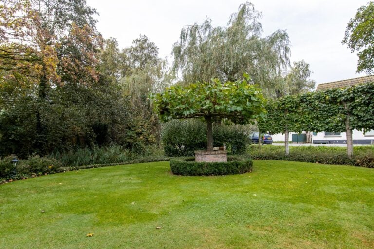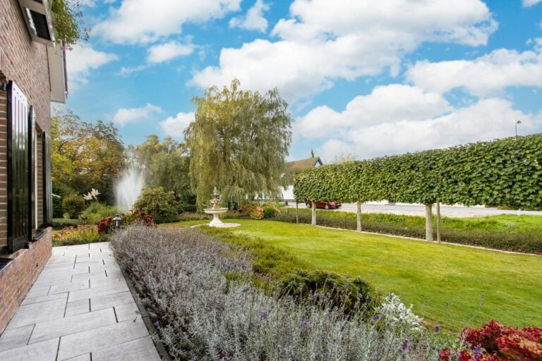 De royale tuin van dit prachtig gelegen landhuis is een ware droom voor buitenliefhebbers. Op het ruime perceel van 4.550 m² geniet u van absolute privacy en rust te midden van het groen. De tuin is zorgvuldig aangelegd met meerdere terrassen, elk met hun eigen unieke sfeer en uitzicht. Het starline zwembad met solar roldeck is uitgerust met een complete waterbehandeling die automatisch wordt geregeld. En om het zwemseizoen te verlengen, kan het bad tevens worden opgewarmd met de aanwezige warmtepomp (2024). De romantische vijver, met fontein en bruggetje, voegt een extra vleugje charme toe aan het geheel. De lange oprijlaan is toegankelijk middels de elektrische poort en biedt volop plek voor het parkeren van meerdere voertuigen. Met een uitgestrekt perceel, compleet met een weelderig gazon, sfeervolle terrassen en diverse overkappingen, is er voldoende ruimte om in alle seizoenen te genieten van het buitenleven.