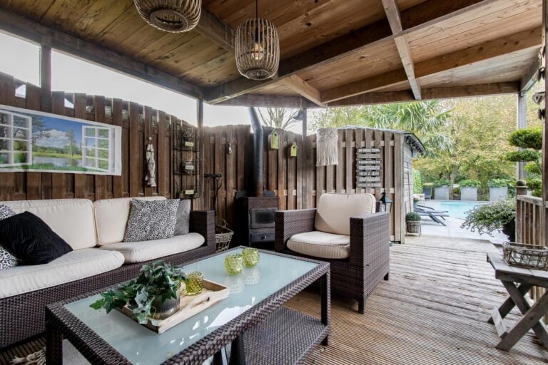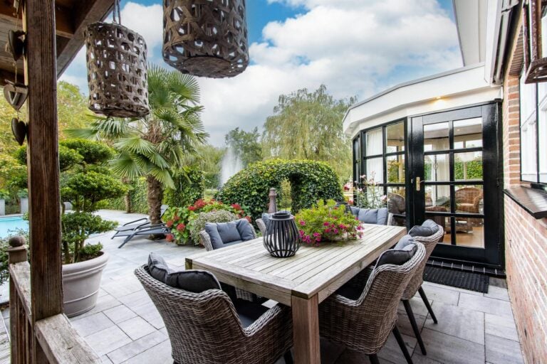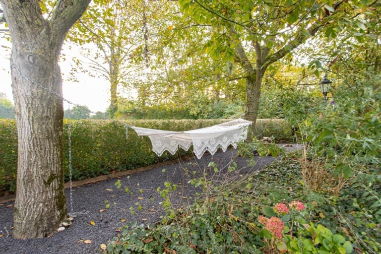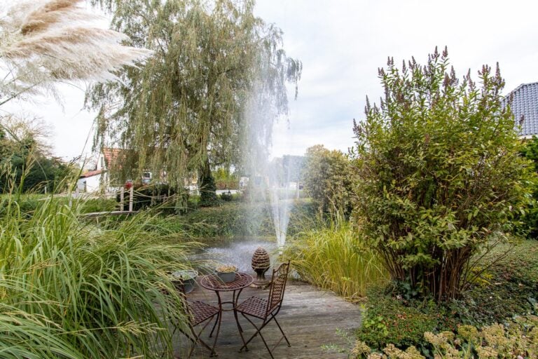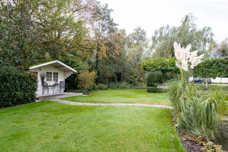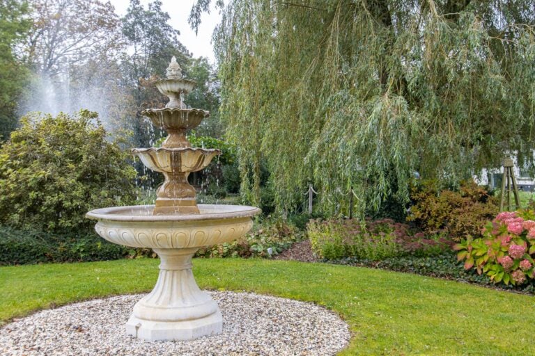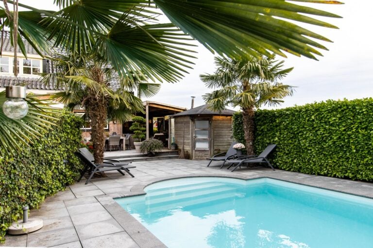 De royale tuin van dit prachtig gelegen landhuis is een ware droom voor buitenliefhebbers. Op het ruime perceel van 4.550 m² geniet u van absolute privacy en rust te midden van het groen. De tuin is zorgvuldig aangelegd met meerdere terrassen, elk met hun eigen unieke sfeer en uitzicht. Het starline zwembad met solar roldeck is uitgerust met een complete waterbehandeling die automatisch wordt geregeld. En om het zwemseizoen te verlengen, kan het bad tevens worden opgewarmd met de aanwezige warmtepomp (2024). De romantische vijver, met fontein en bruggetje, voegt een extra vleugje charme toe aan het geheel. De lange oprijlaan is toegankelijk middels de elektrische poort en biedt volop plek voor het parkeren van meerdere voertuigen. Met een uitgestrekt perceel, compleet met een weelderig gazon, sfeervolle terrassen en diverse overkappingen, is er voldoende ruimte om in alle seizoenen te genieten van het buitenleven.