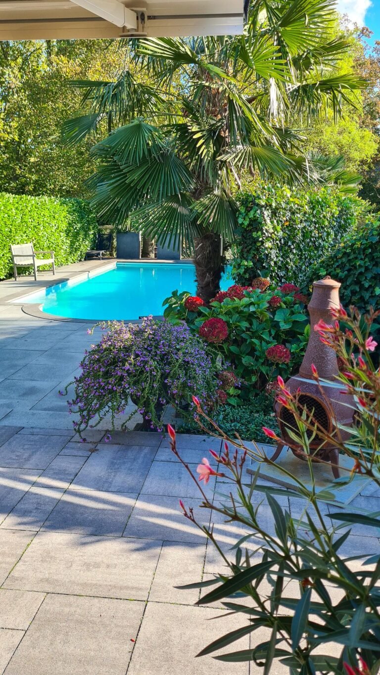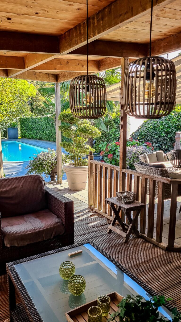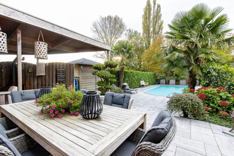 • fraai aangelegde tuin met zwembad, terrassen en overkappingen;