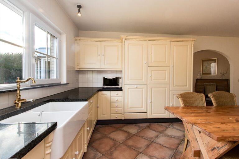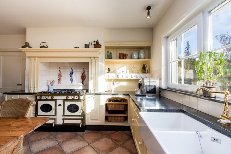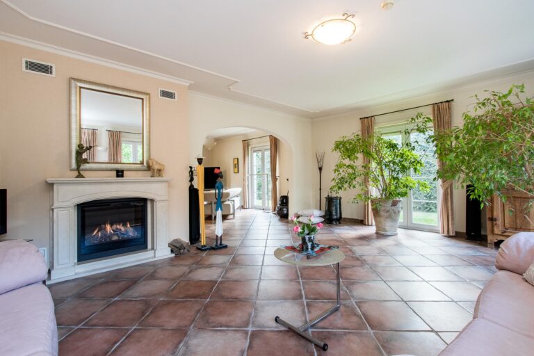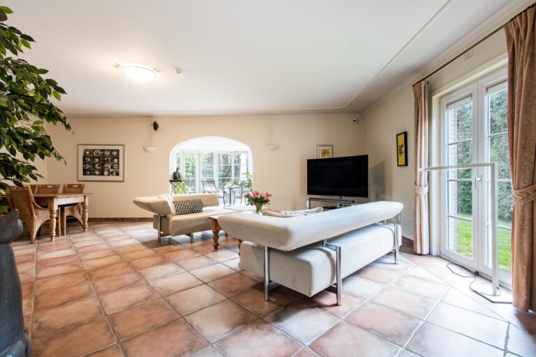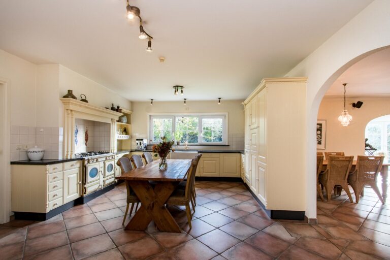 De royale woonkamer met serre, salon en living zorgen dankzij de overvloedige aanwezigheid van openslaande deuren voor veel licht en creëren een naadloze connectie tussen binnen en buiten. De serre geeft direct toegang tot het terras en biedt een fraai uitzicht op de weelderige achtertuin. De woonkamer staat in half open verbinding met de keuken voorzien van een indrukwekkend fornuis, fraai betegelde schouw en ruime keukenkasten met inbouwapparatuur.