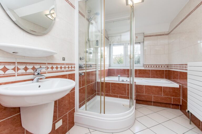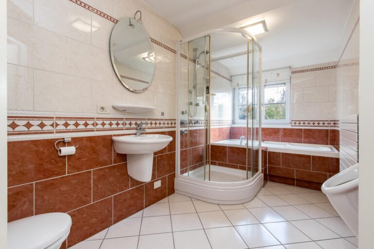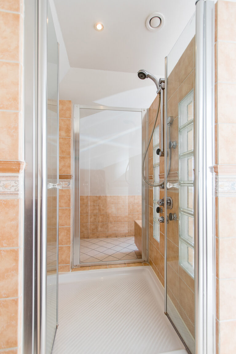 De badkamer bij de master bedroom biedt een ware wellness-ervaring met een jacuzzi, regendouche, 2 wastafels, design radiator, toilet en urinoir. De 2e badkamer straalt luxe uit met een whirlpool, douchecabine met regendouche, wastafel, toilet en urinoir.