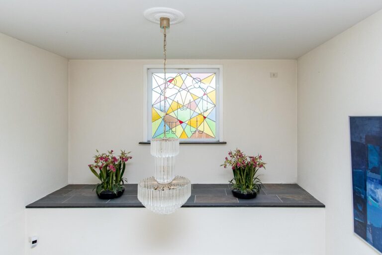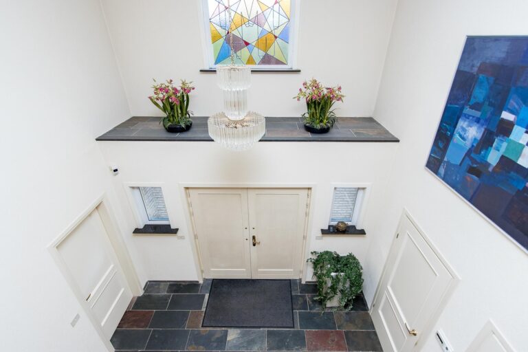 Begane grond: de imposante entree met dubbele voordeuren geeft toegang tot de royale ontvangsthal met toiletruimte, meterkast en personenlift. De prachtige compositie van het glas-in-lood venster in de entree zorgt voor een fraaie lichtinval. De open houten trap slingert elegant omhoog tot aan de ruime balustrade van de vide en de overloop, waardoor een indrukwekkende overgang ontstaat tussen de verschillende niveaus van het huis. De trap aan de dichte zijde is subtiel verlicht. Vanuit de hal zijn de woonkamer en keuken bereikbaar.
