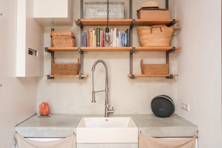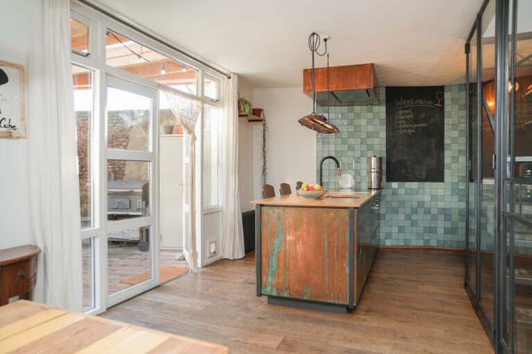 Vanuit de hal kom je in de ruime woonkamer met open keuken. De keuken in industriële stijl beschikt over een kook- en spoeleiland en vormt het hart van het huis. Twee paar openslaande deuren geven direct toegang tot de sfeervolle overkapping en de diepe achtertuin, ideaal voor binnen-buiten genieten. Via een luik is de kelderruimte bereikbaar, handig voor extra opslag.