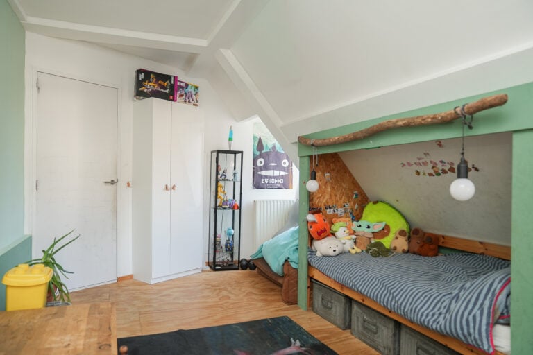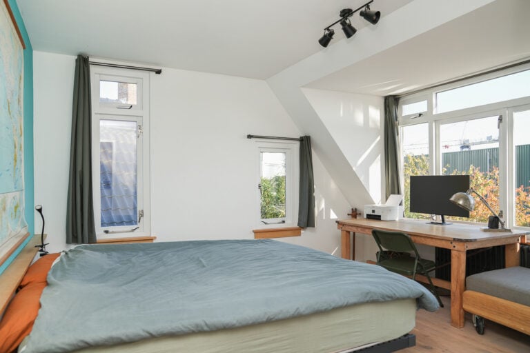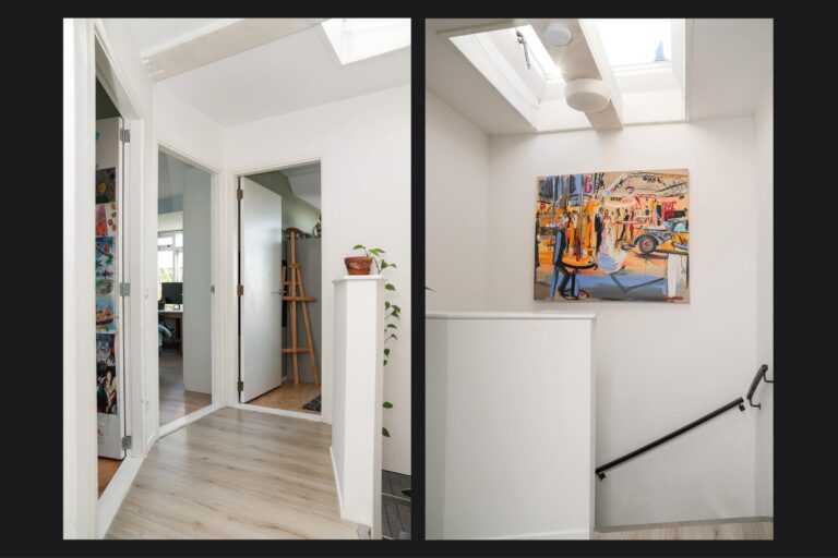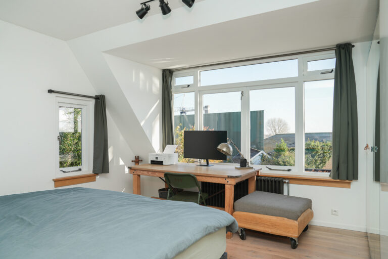 Eerste verdieping: de overloop biedt toegang tot drie ruime slaapkamers, allen voorzien van een dakkapel die voor extra licht en ruimte zorgt. De grote, stoere badkamer is uitgerust met een ligbad, inloopdouche, wandcloset en een badkamermeubel met dubbele wastafel.