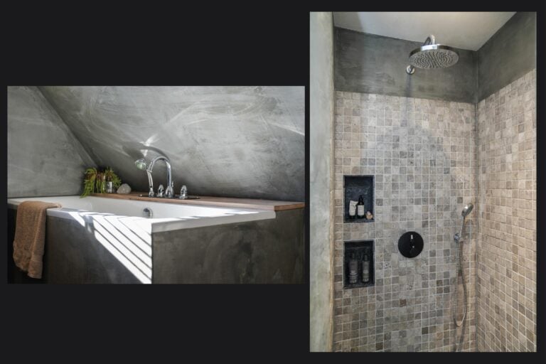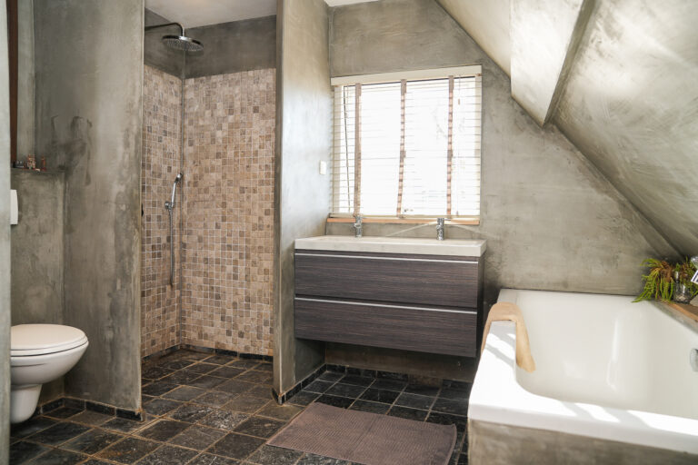 • grote, moderne en stoere badkamer met ligbad, inloopdouche, wandcloset en dubbele wastafel;