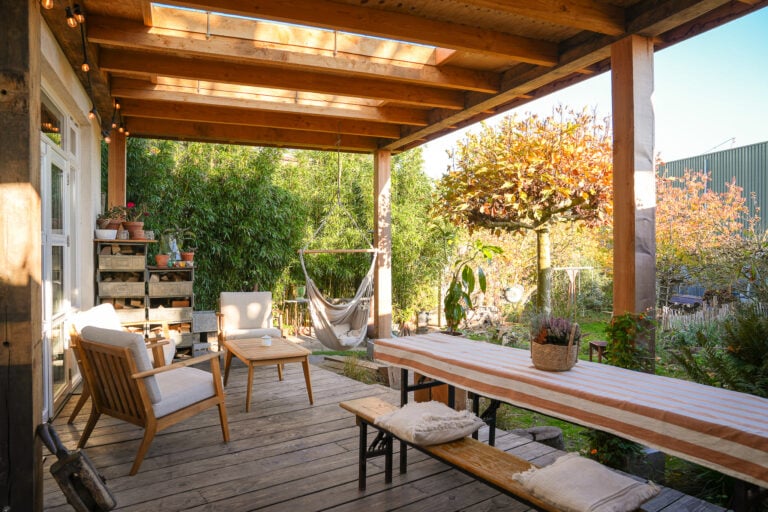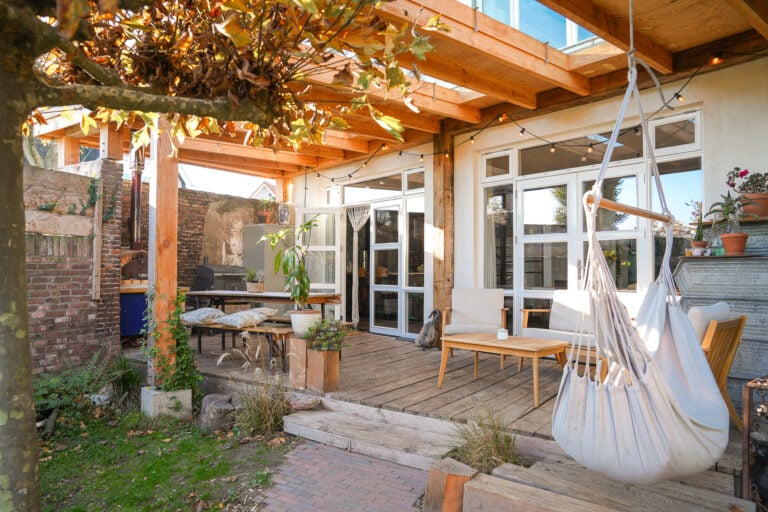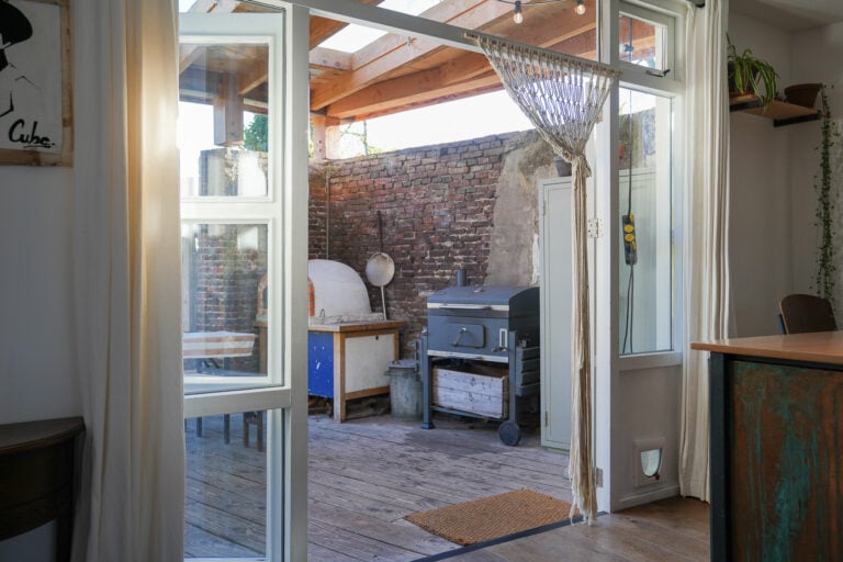 • grote raampartijen en twee paar openslaande deuren aan de achterzijde voor veel licht en verbinding met de tuin;