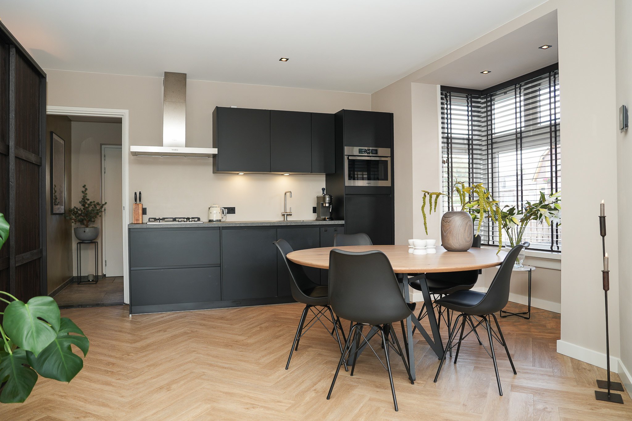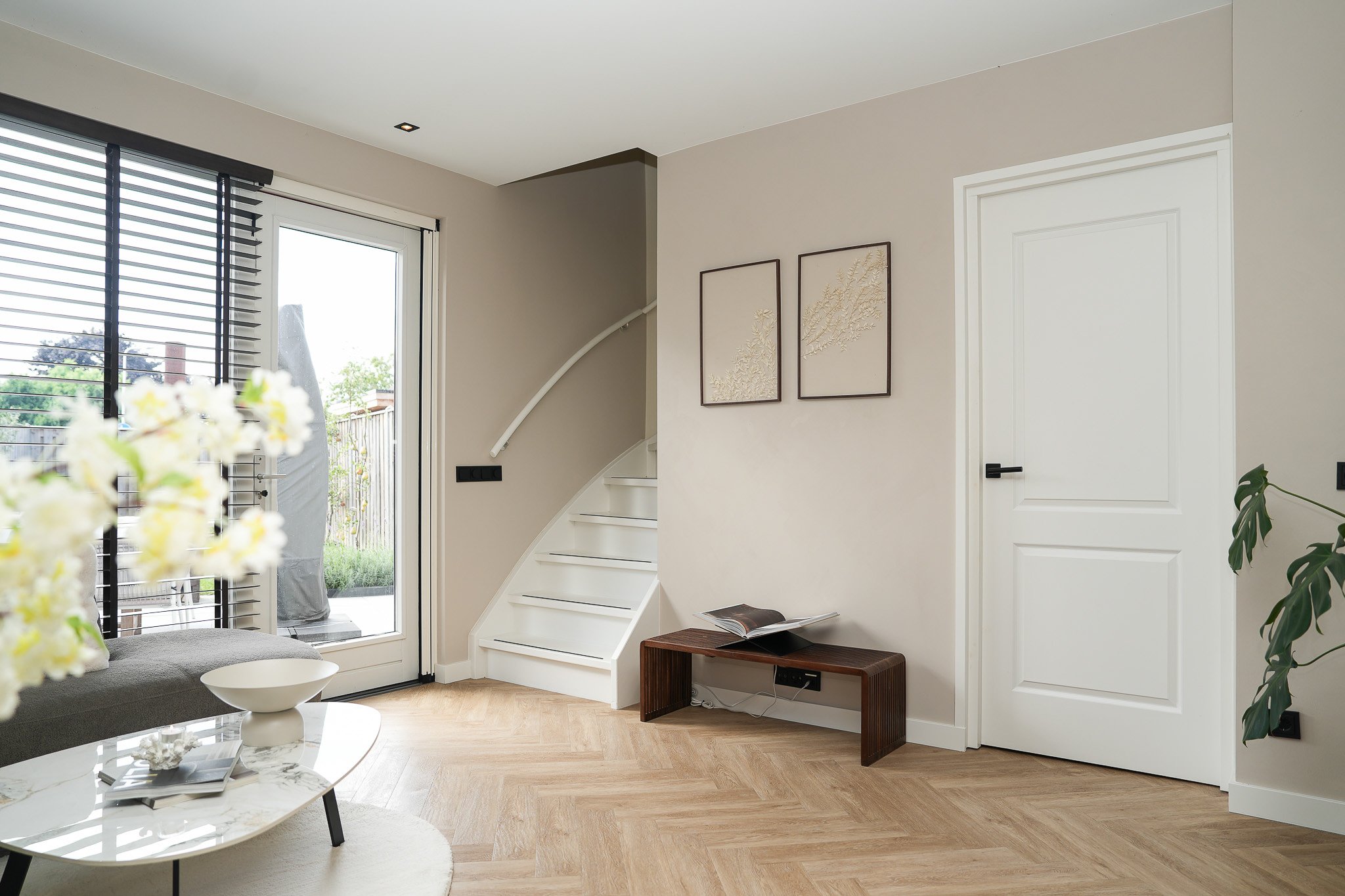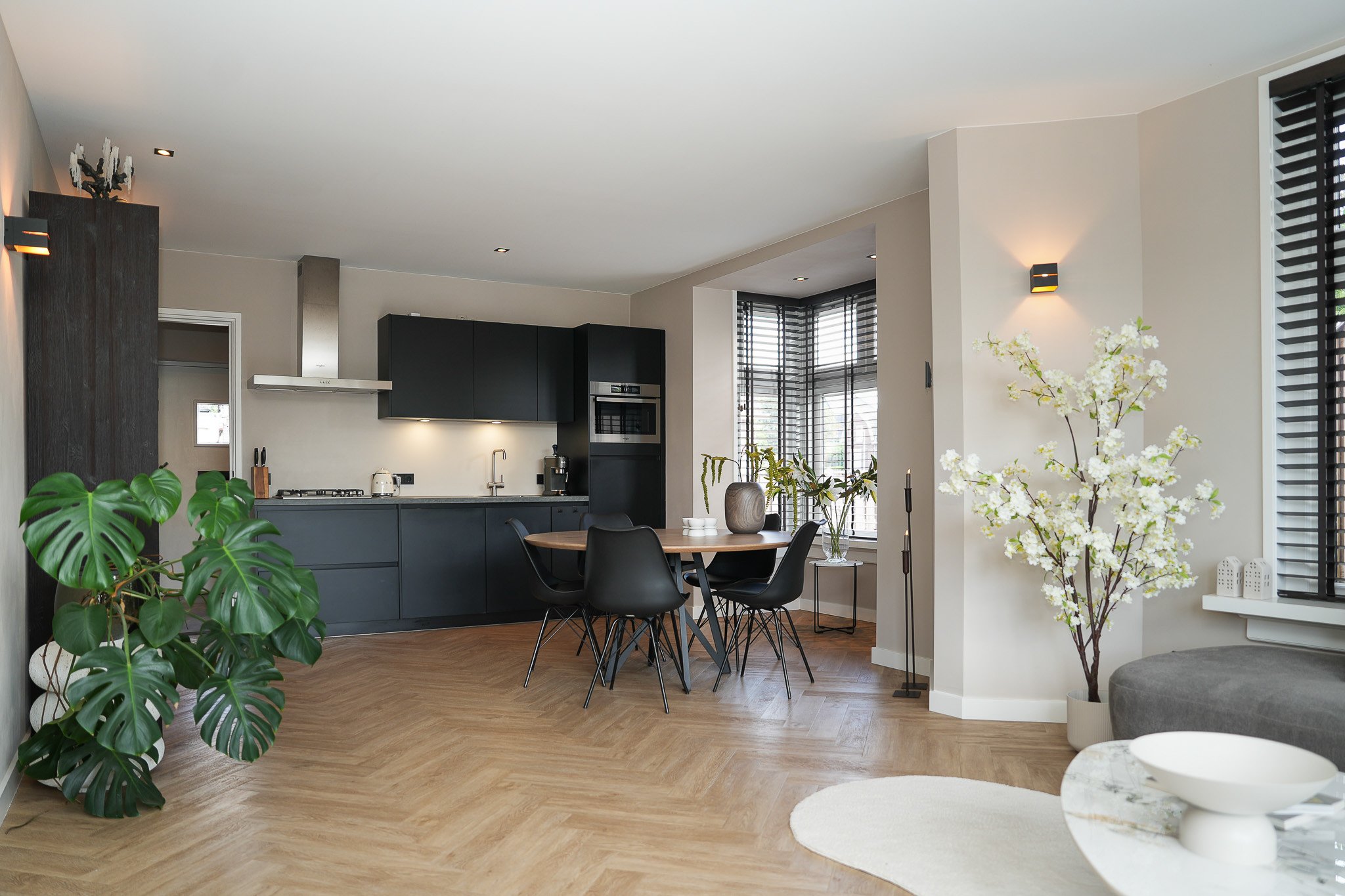 Binnen word je direct verrast door de lichte en sfeervolle living met erker en de prachtige visgraatvloer, die de ruimte een stijlvolle uitstraling geeft. De open keuken is het hart van het huis – een fijne plek om te koken en te genieten.