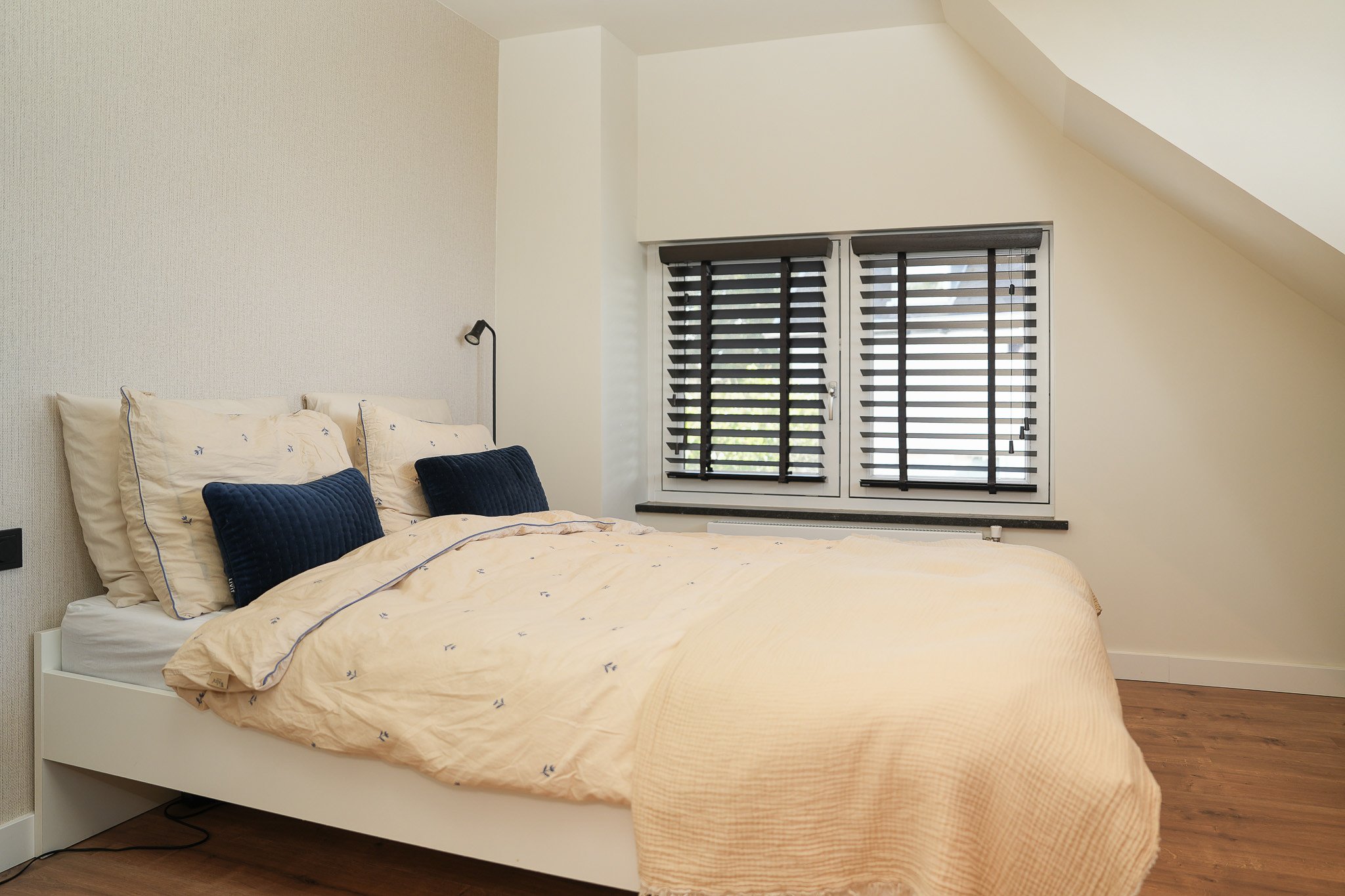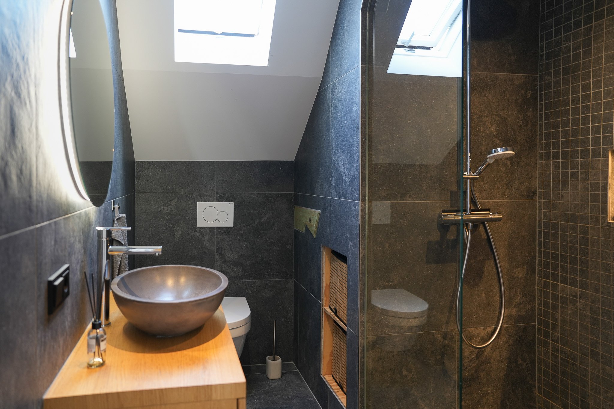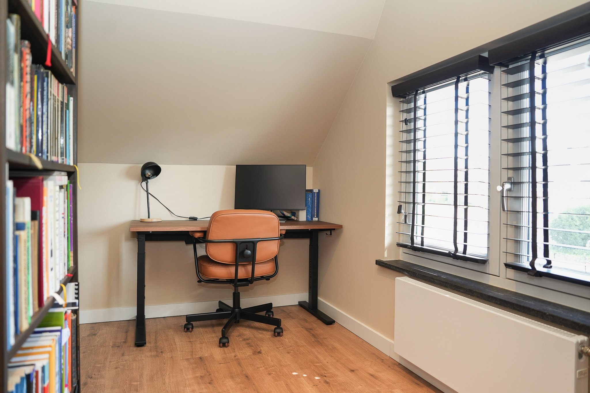Eerste verdieping: de overloop biedt toegang tot twee ruime slaapkamers en de moderne badkamer. De slaapkamer aan de achterzijde is extra sfeervol dankzij het dakkapel, de houten spanten en de mooie lichtinval. De badkamer is compleet uitgerust met een stijlvol badkamermeubel met waskom, een ruime inloopdouche, wandcloset en vloerverwarming voor extra comfort.