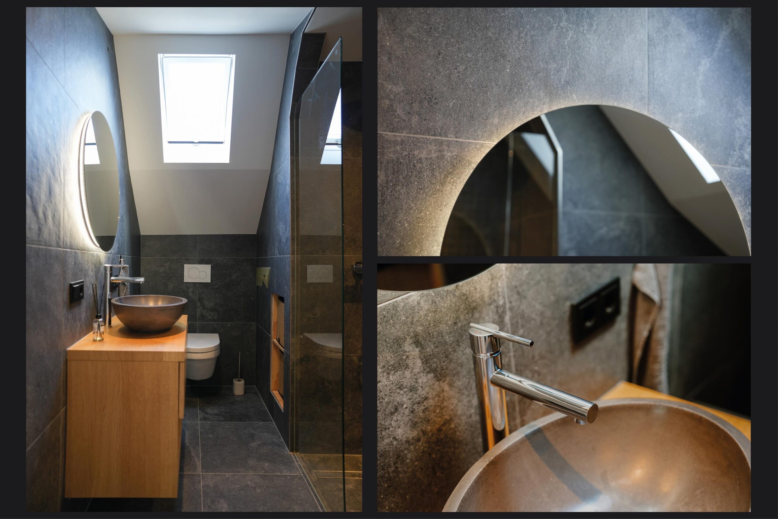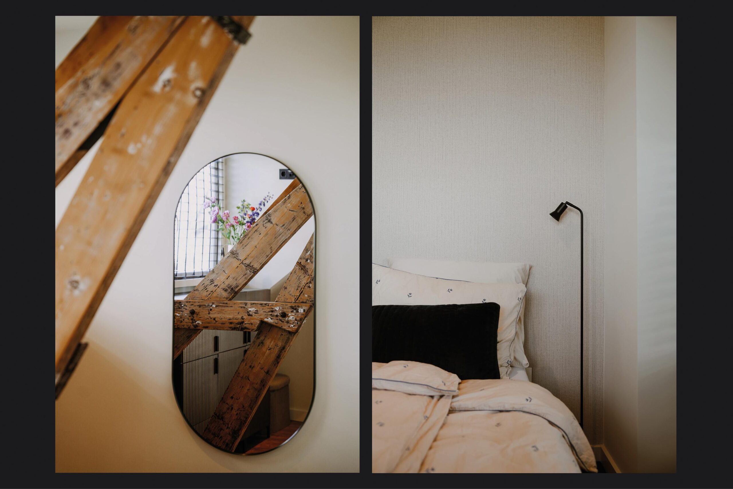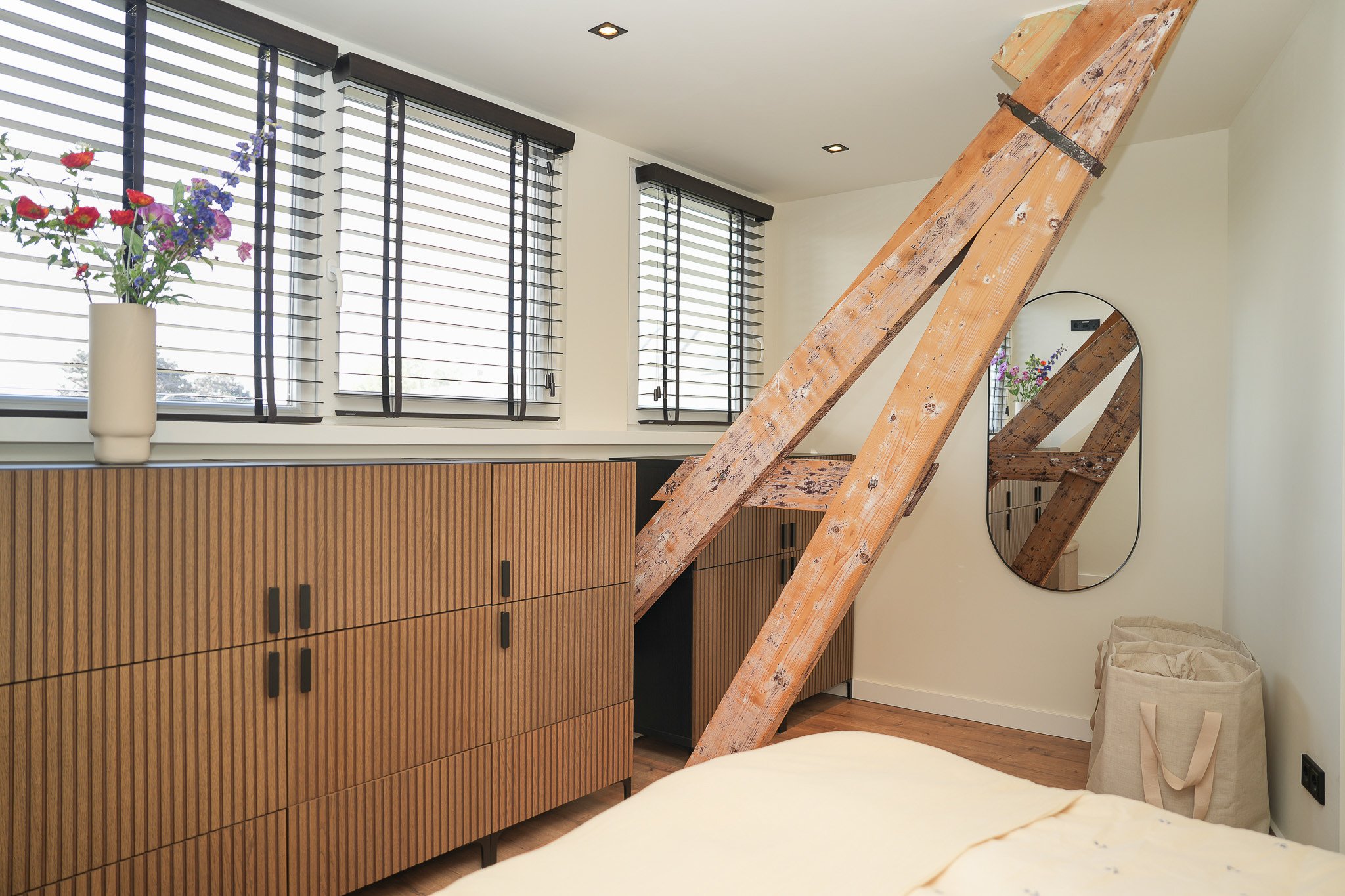 Eerste verdieping: de overloop biedt toegang tot twee ruime slaapkamers en de moderne badkamer. De slaapkamer aan de achterzijde is extra sfeervol dankzij het dakkapel, de houten spanten en de mooie lichtinval. De badkamer is compleet uitgerust met een stijlvol badkamermeubel met waskom, een ruime inloopdouche, wandcloset en vloerverwarming voor extra comfort.