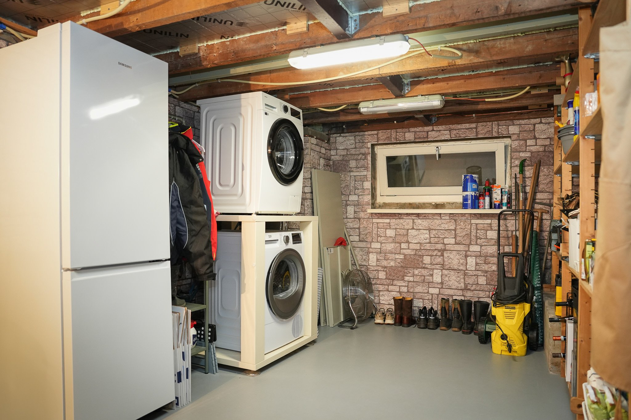 Via een portaal bereik je de verrassend ruime kelder, ideaal voor opslag, hobby’s of als wijnkelder. Een open trapopgang leidt naar de eerste verdieping, terwijl een loopdeur toegang geeft tot de zonnige achtertuin.