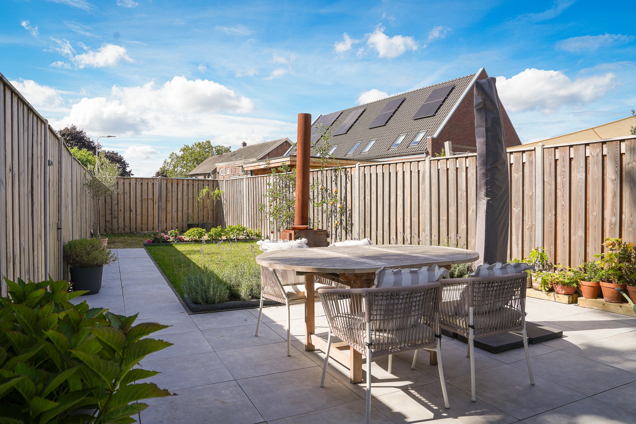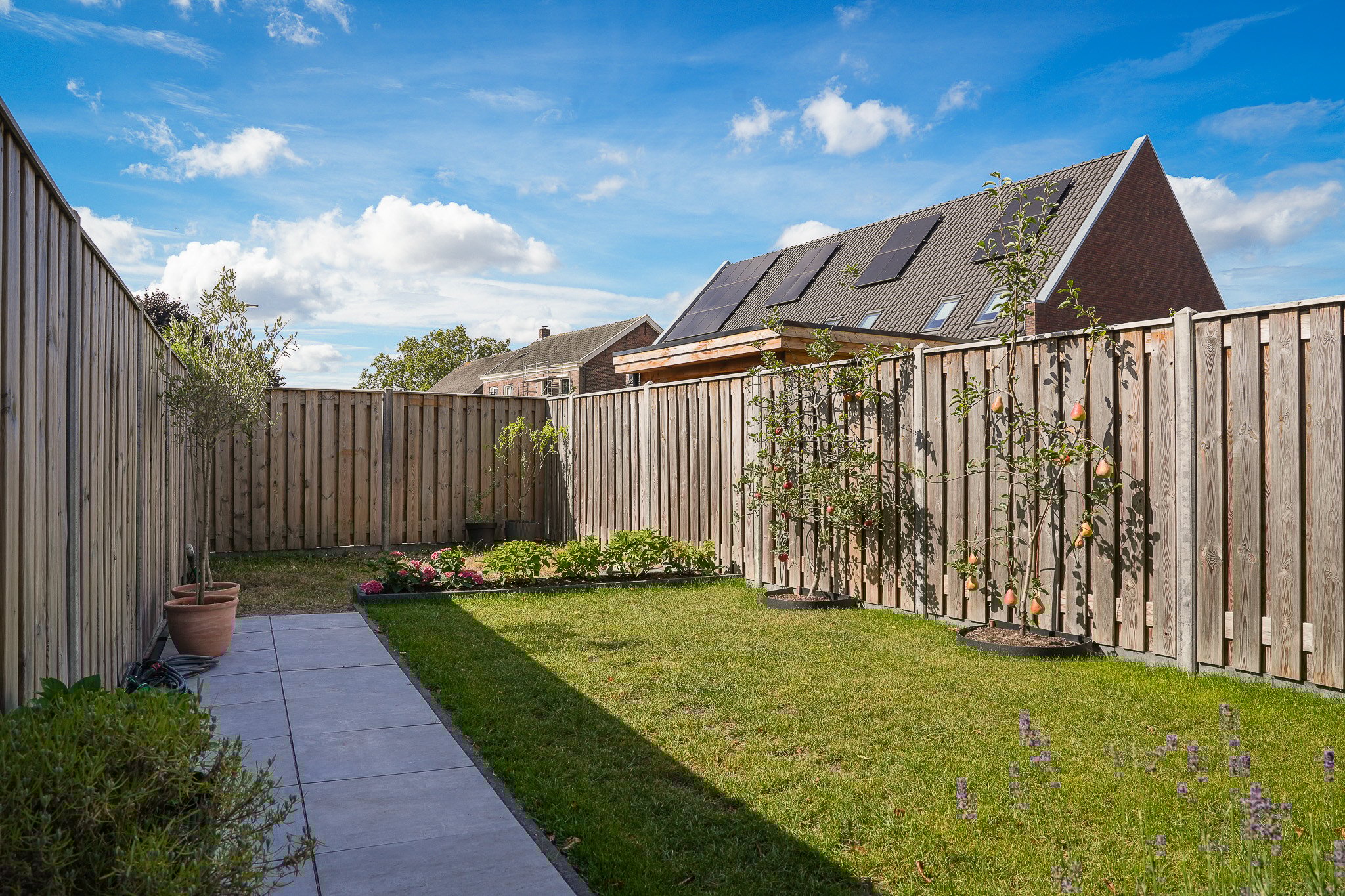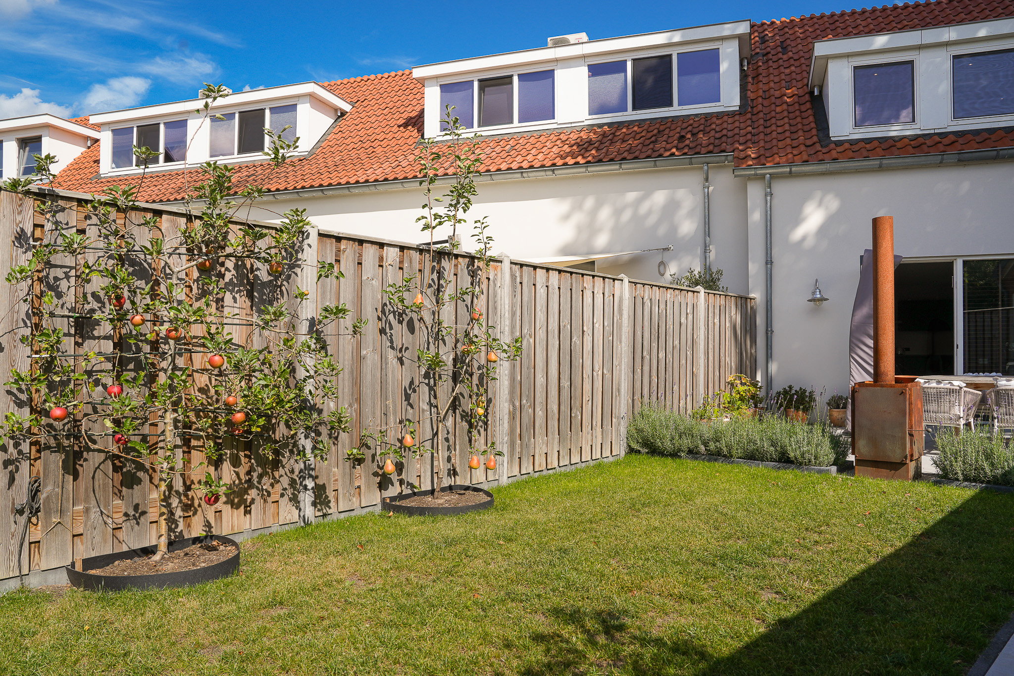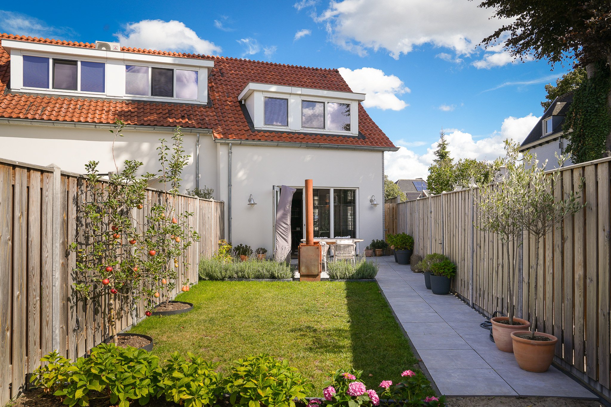 Buiten geniet je van de fraai aangelegde achtertuin op het zuiden, voorzien van moderne terrastegels, een groen gazon, sfeervolle borders en fruitbomen. De tuin is volledig omheind, biedt volop privacy en heeft een praktische achterom.