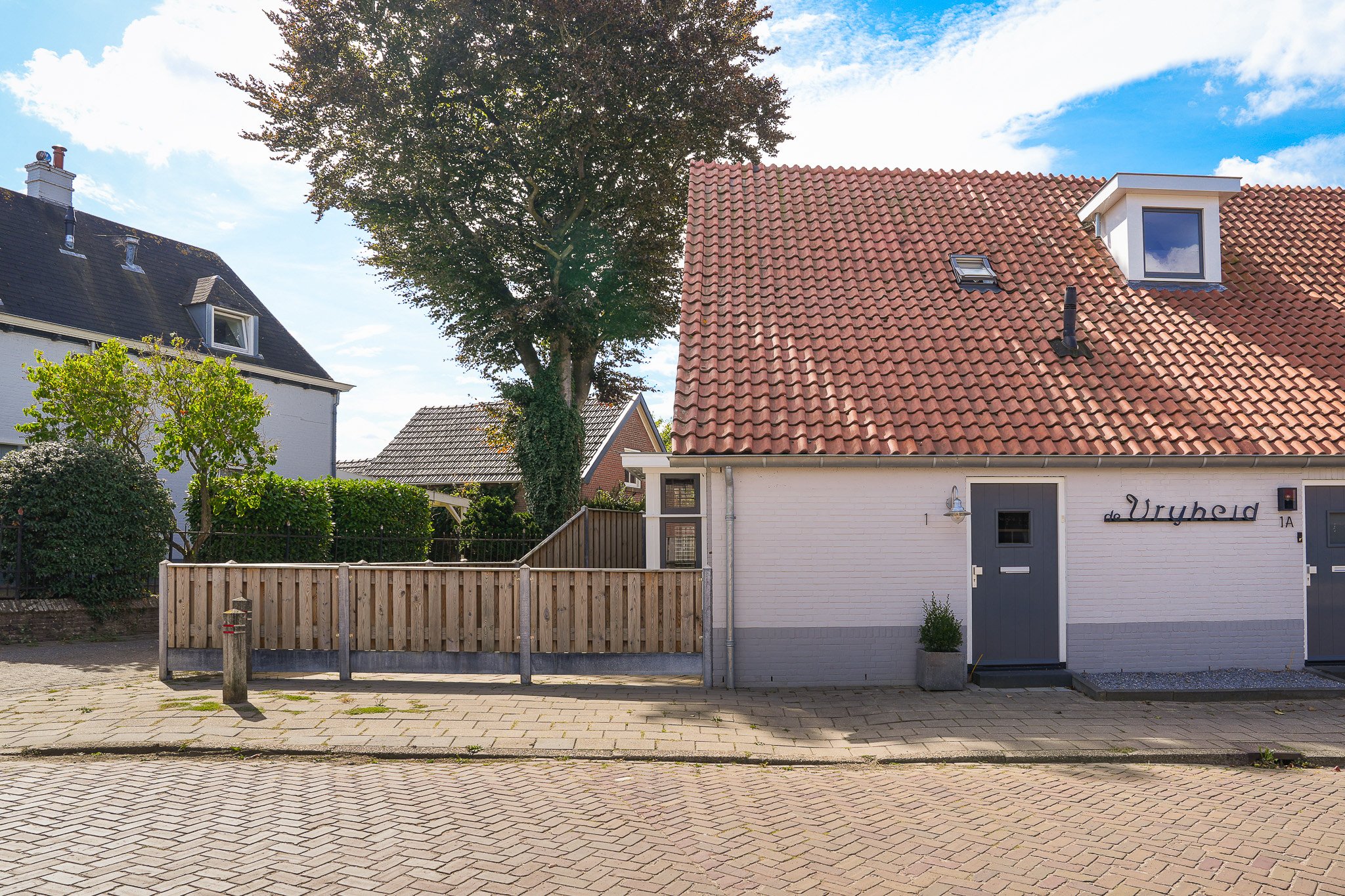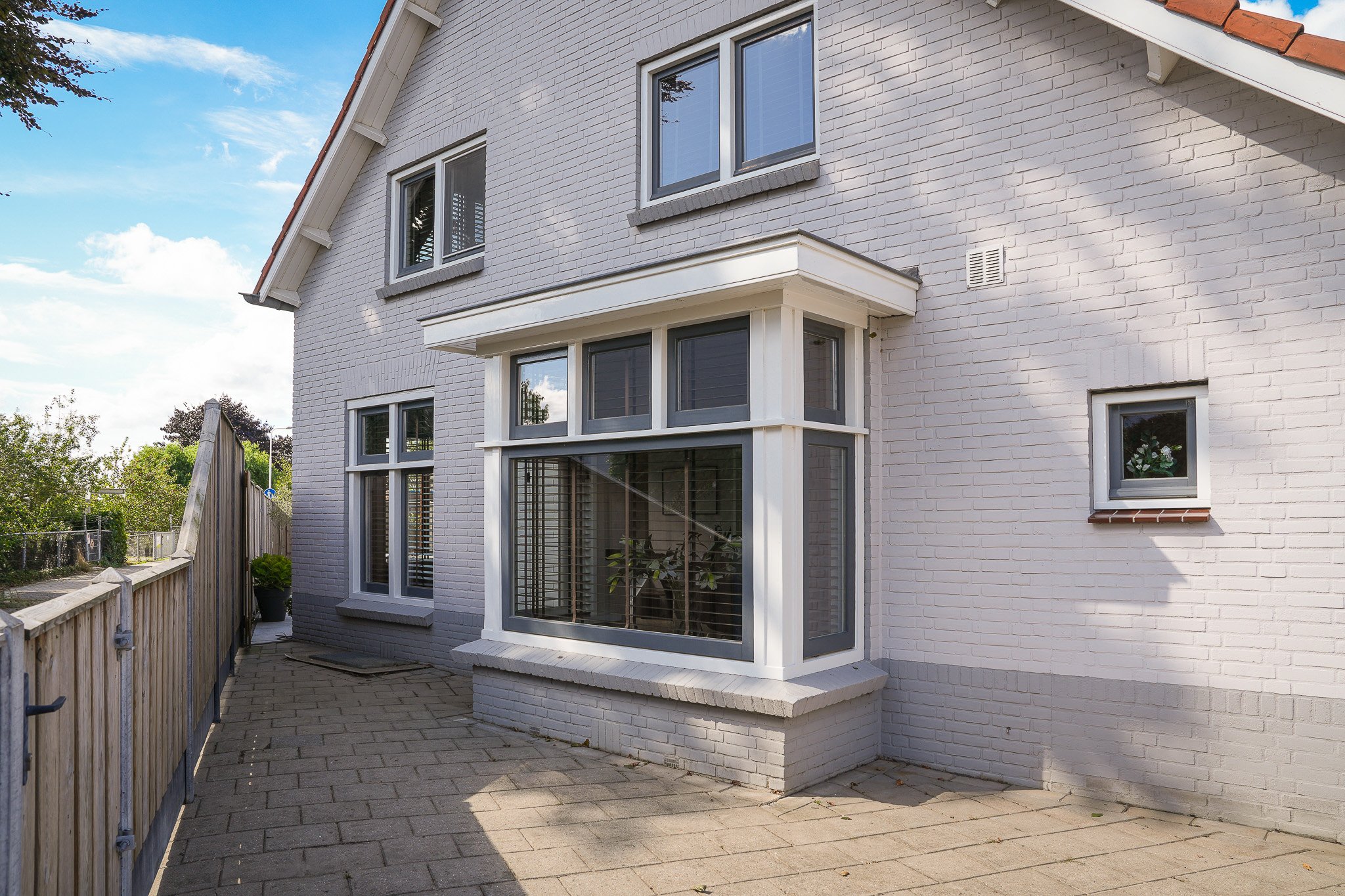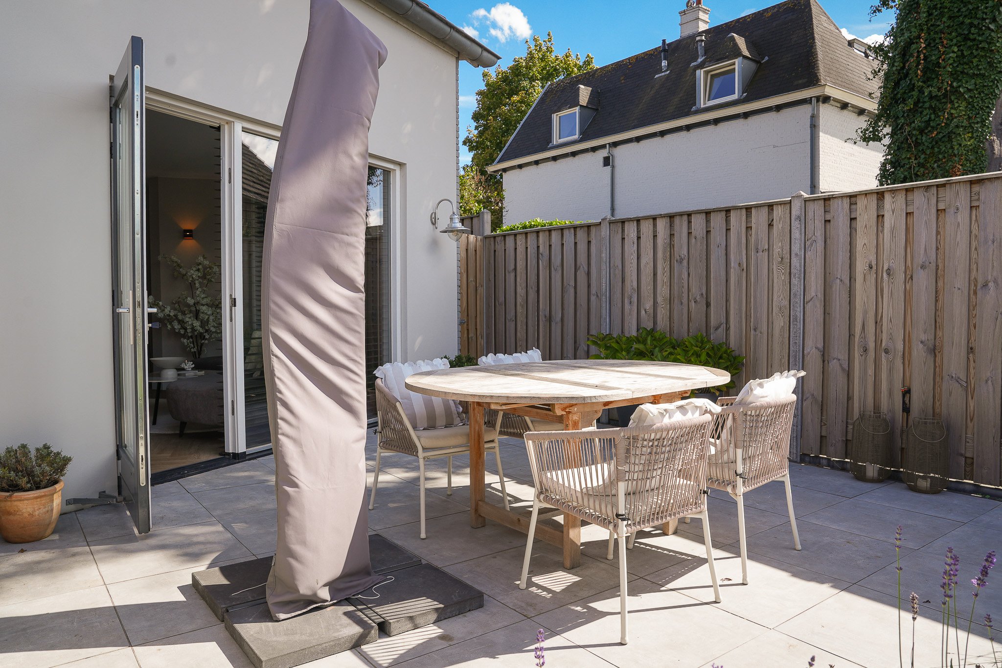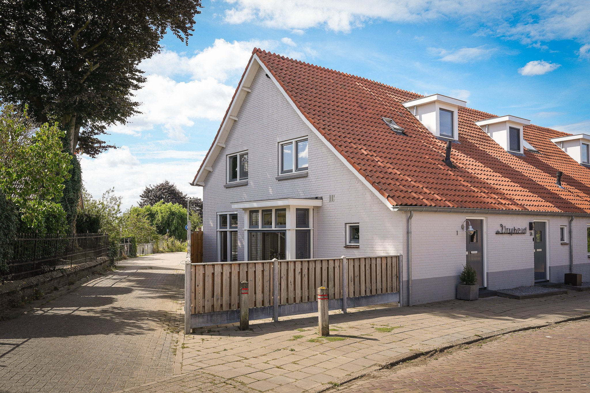 Buiten geniet je van de fraai aangelegde achtertuin op het zuiden, voorzien van moderne terrastegels, een groen gazon, sfeervolle borders en fruitbomen. De tuin is volledig omheind, biedt volop privacy en heeft een praktische achterom.