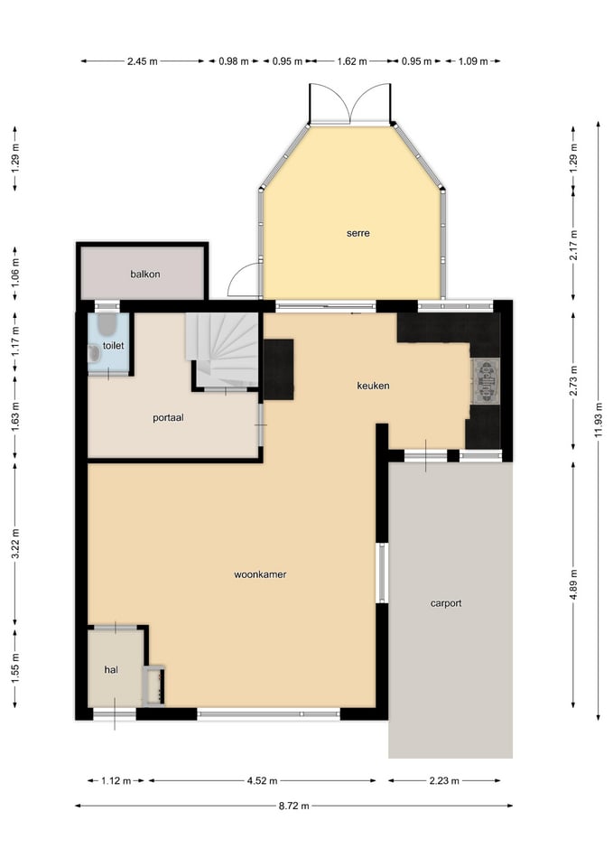 Indeling: de entree geeft toegang tot de hal met meterkast Via de hal stapt u de ruime woonkamer binnen die in open verbind staat met de ruime woonkeuken aan de achterzijde. Aangrenzend bevindt zich de fraaie serre van ca. 11 m² die middels schuifdeuren afsluitbaar is. Vanuit de keuken is het portaal bereikbaar met het toilet en trapopgang naar de verdieping en het souterrain.