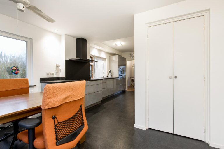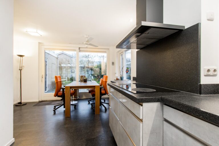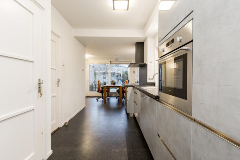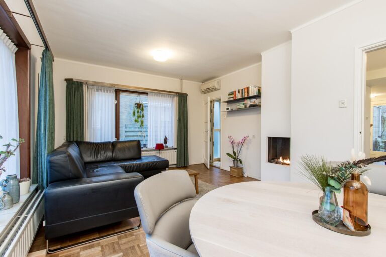 Indeling woonhuis: de entree bevindt zich aan de linkerzijde en geeft toegang tot de hal met garderobe, toilet en meterkast. Vanuit de hal stapt u de woonkamer of de dichte keuken binnen. De woonkamer is aan de voorzijde gesitueerd en is voorzien van fraaie parketvloer, sfeervolle gaskachel en grote raampartijen. Aan de achterzijde bevindt zich de keuken voorzien van rechte keukenunit met diverse inbouwapparatuur, zoals een inductie kookplaat, afzuigkap, oven en vaatwasser. De keuken is voorzien van bijkeuken met witgoedaansluiting en ruimte voor een grote koel-/ vriescombinatie, praktische trapkast en schuifpui naar de achtertuin. Vanuit de keuken is de garage bereikbaar.