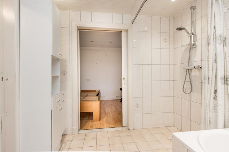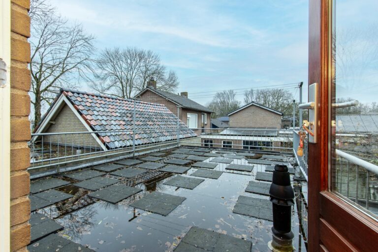Eerste verdieping: de overloop geeft aan de voorzijde toegang tot een ruime slaapkamer met vaste kastruimte en aan de andere zijde tot de badkamer met ligbad, douche, wandcloset en bandkamermeubel. Vanuit de badkamer is de 2e slaapkamer bereikbaar met loopdeur naar het royale dakterras van ca. 36 m².
