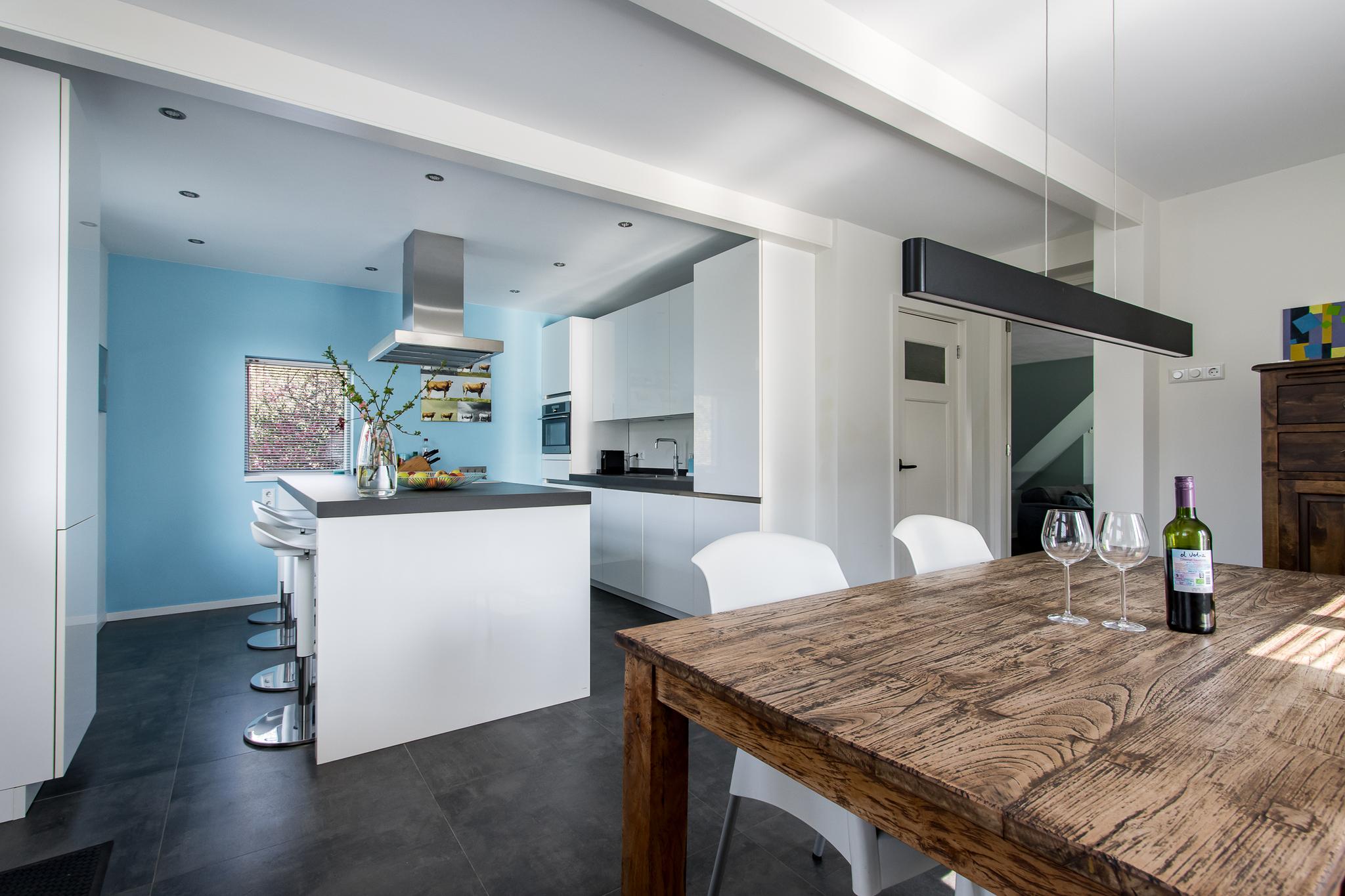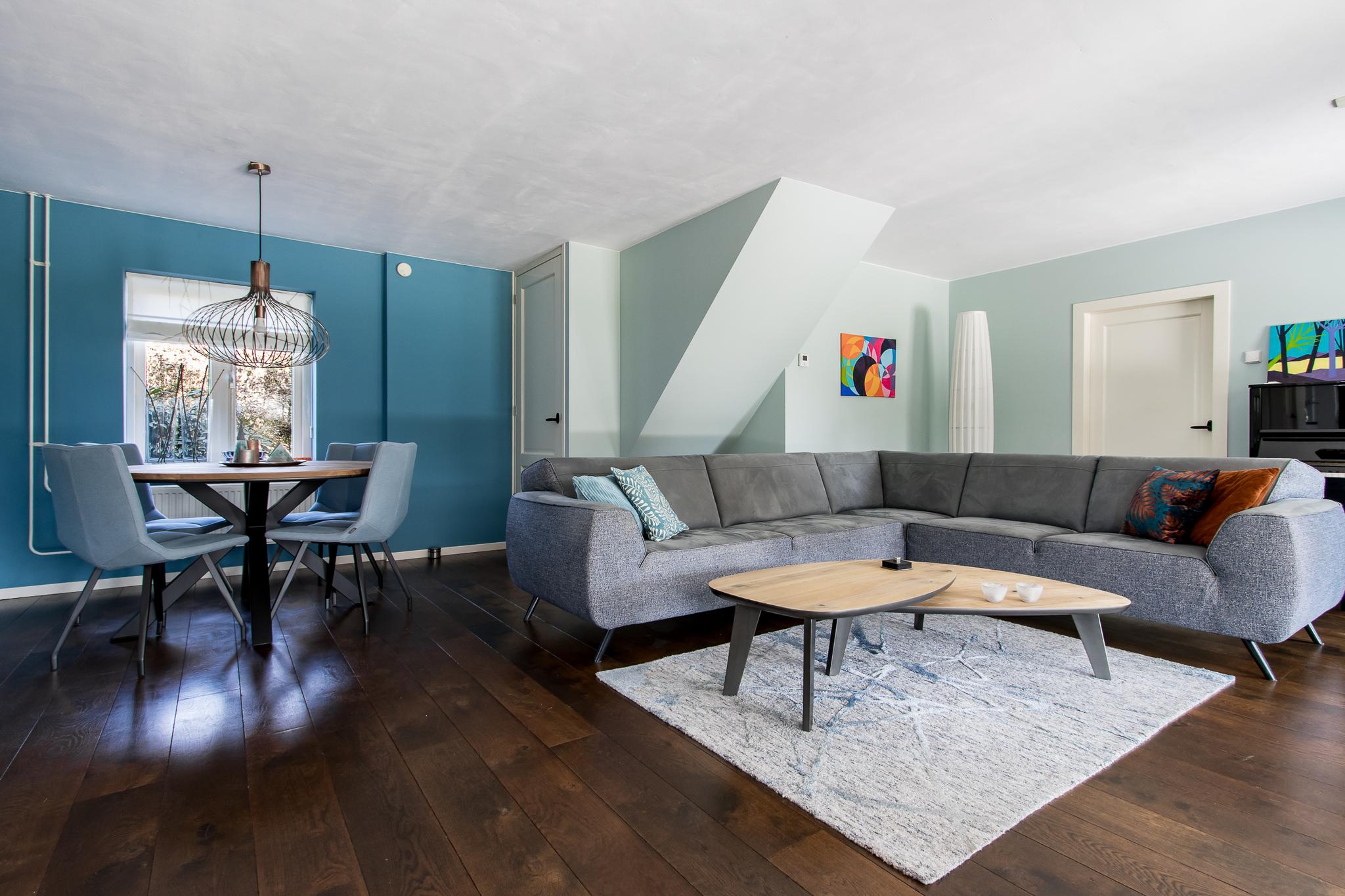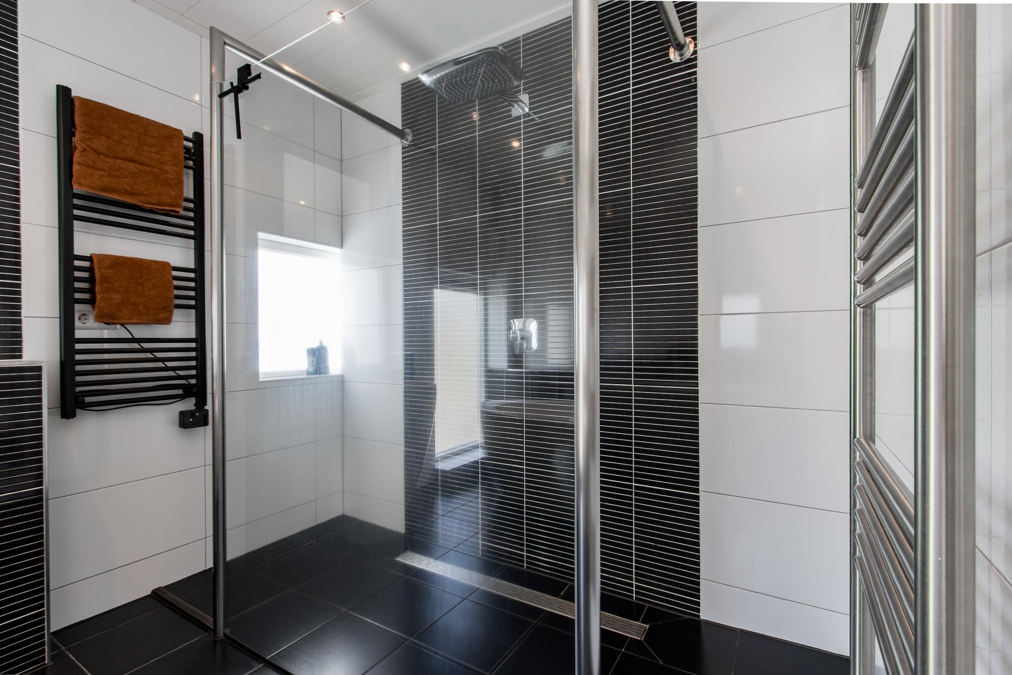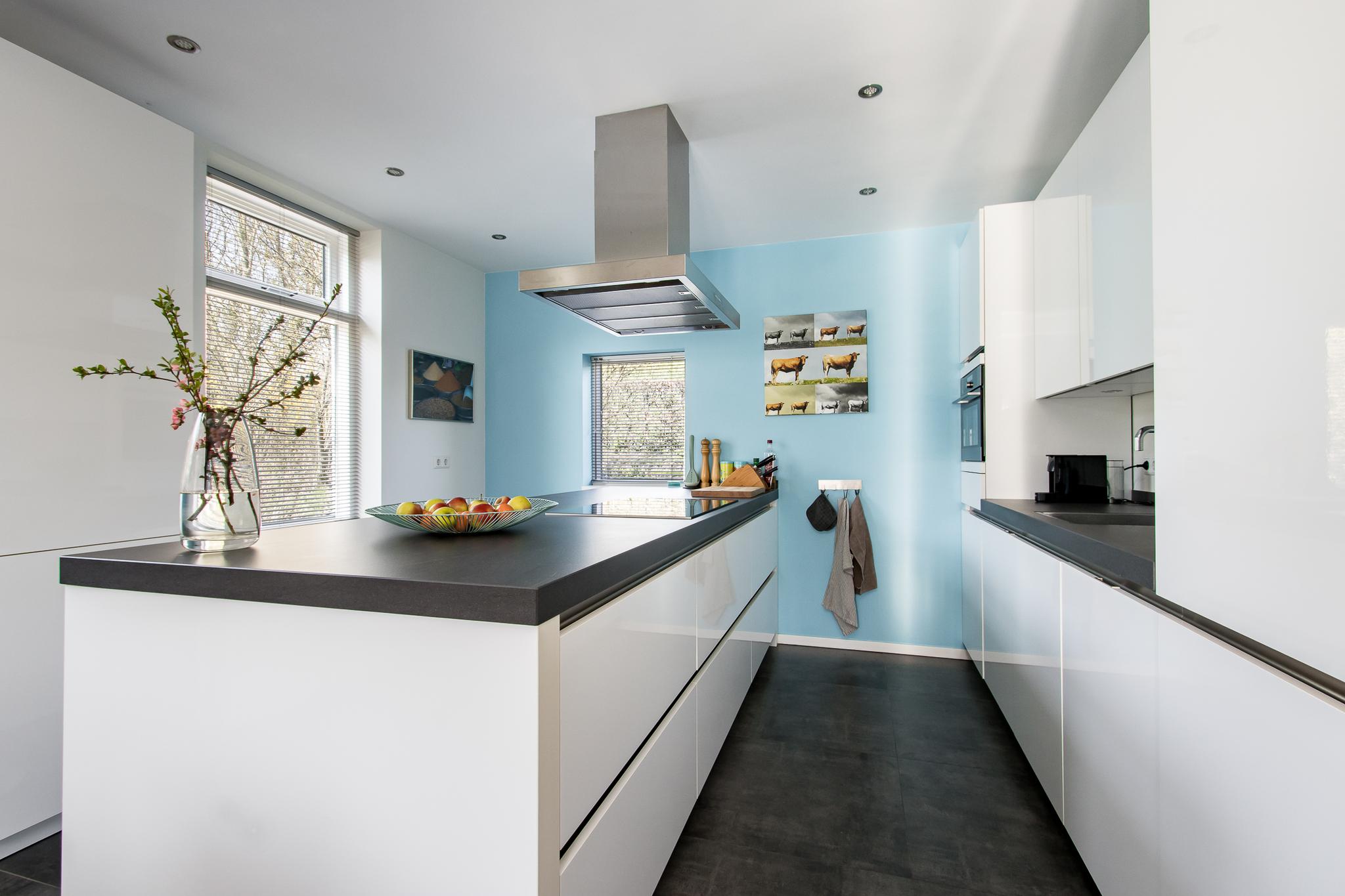 De eigentijdse badkamer is stijlvol ingericht en uitgerust met een inloopdouche, een strak vormgegeven bad en een wastafel. Via de hal stapt u de ruime en lichte woonkamer binnen, waar openslaande deuren niet alleen toegang geven tot het zonnige terras, maar ook een prachtig weids uitzicht over de tuin bieden. De open haard voegt extra sfeer en warmte toe. Aangrenzend bevindt zich de royale woonkeuken, die is voorzien van een moderne keukenunit met kookeiland. Ook deze ruimte heeft een eigen entree, wat zorgt voor extra gemak en toegankelijkheid.