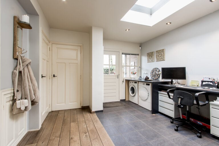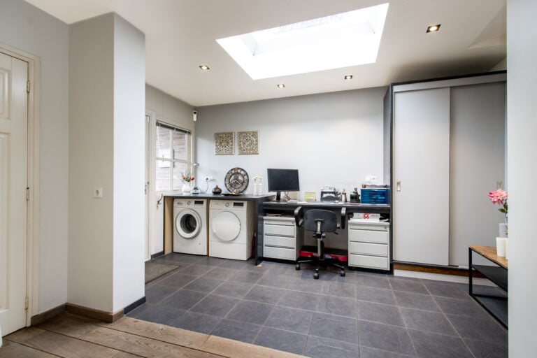 Op de begane grond bevindt zich tevens een complete badkamer. Daarnaast beschikt de woning over een multifunctionele ruimte aan de achterzijde, momenteel ingericht als kantoor en voorzien van witgoedaansluitingen. Deze ruimte leent zich uitstekend als thuiswerkplek, hobbyruimte, bijkeuken of speelkamer – een waardevolle aanvulling op de woonruimte.