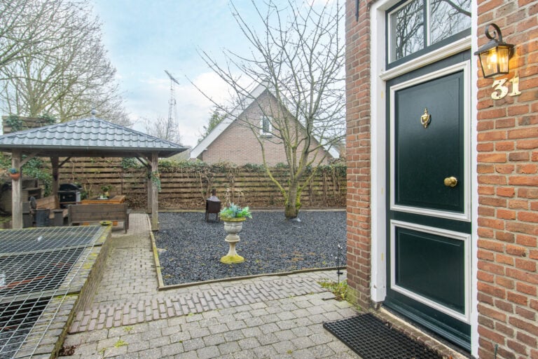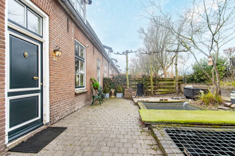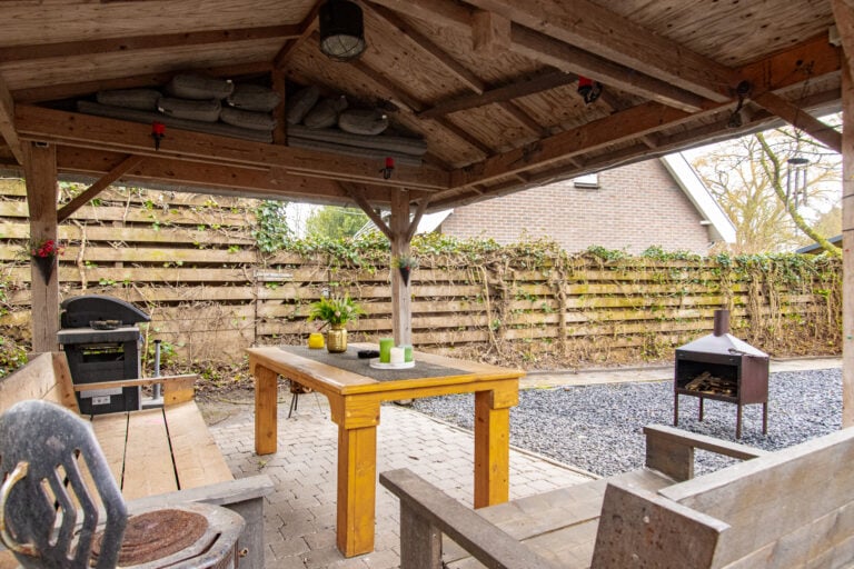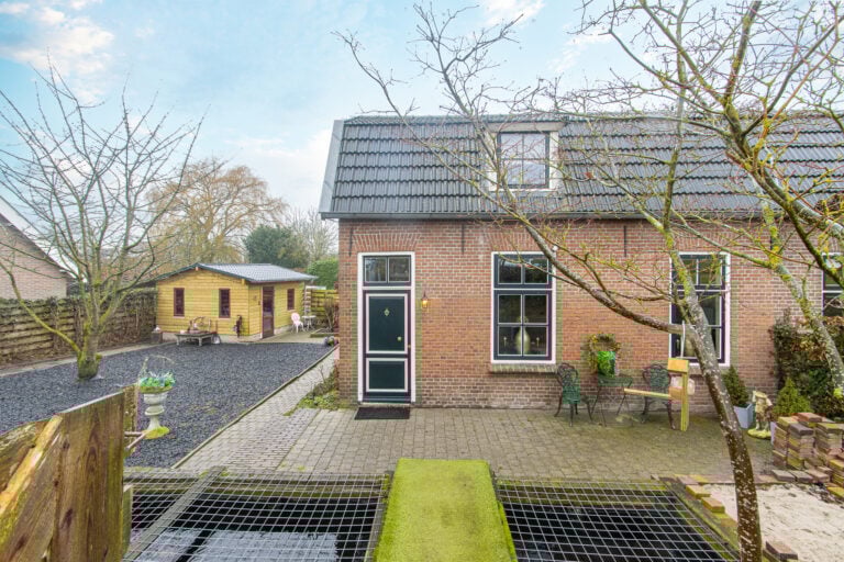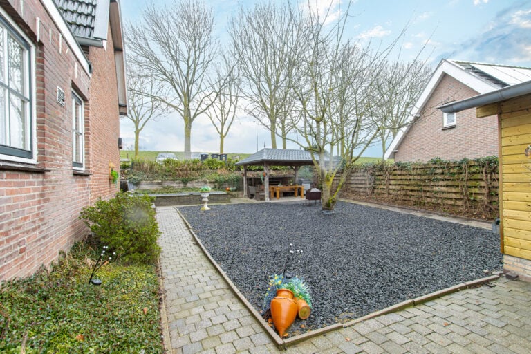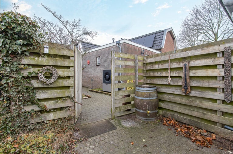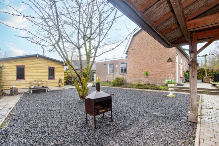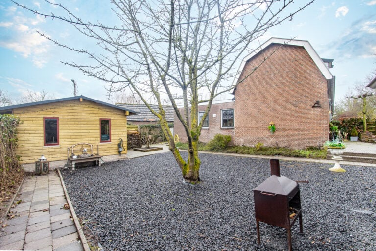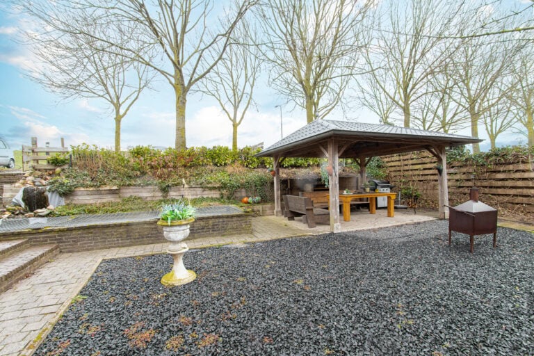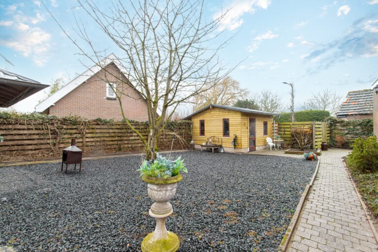 De onderhoudsvriendelijke tuin biedt privacy en comfort. Onder de sfeervolle overkapping is het heerlijk vertoeven, met zicht op het groen en de rust van de omgeving. Daarnaast is er een vrijstaande schuur aanwezig en beschikt de woning over een praktische achterom.
