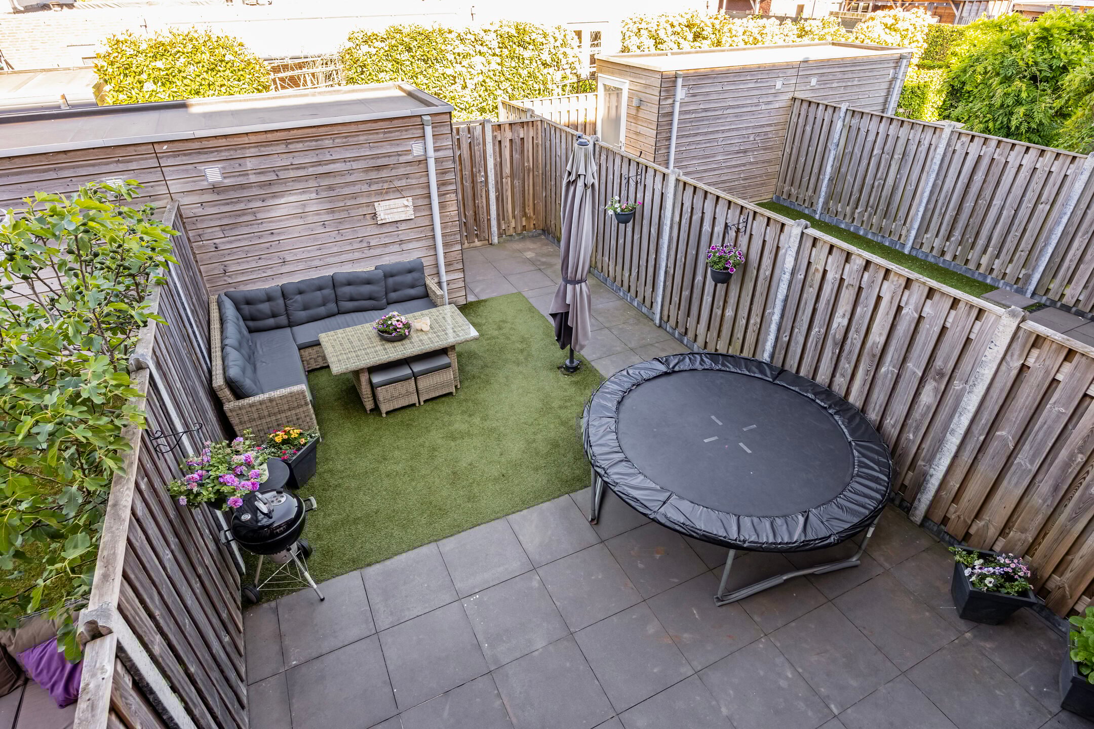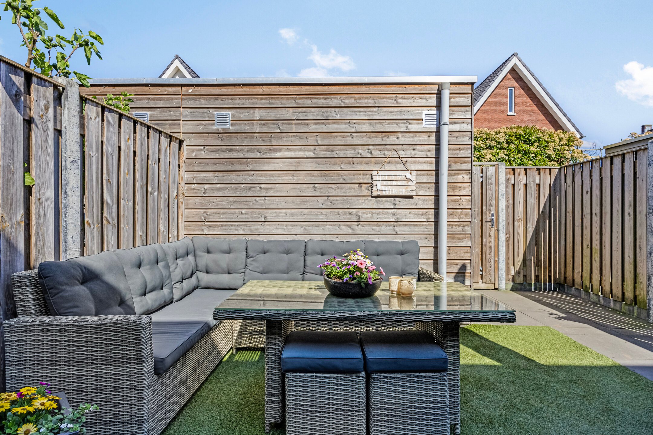 De zonnige achtertuin is een heerlijke plek om te ontspannen. Hij is onderhoudsvriendelijk ingericht met moderne terrastegels en kunstgras. Door de oostelijke ligging geniet je hier van de ochtend- en middagzon. Via de openslaande tuindeuren loop je zo vanuit de woonkamer de tuin in. Achterom bereikbaar én voorzien van een houten berging – praktisch én netjes!