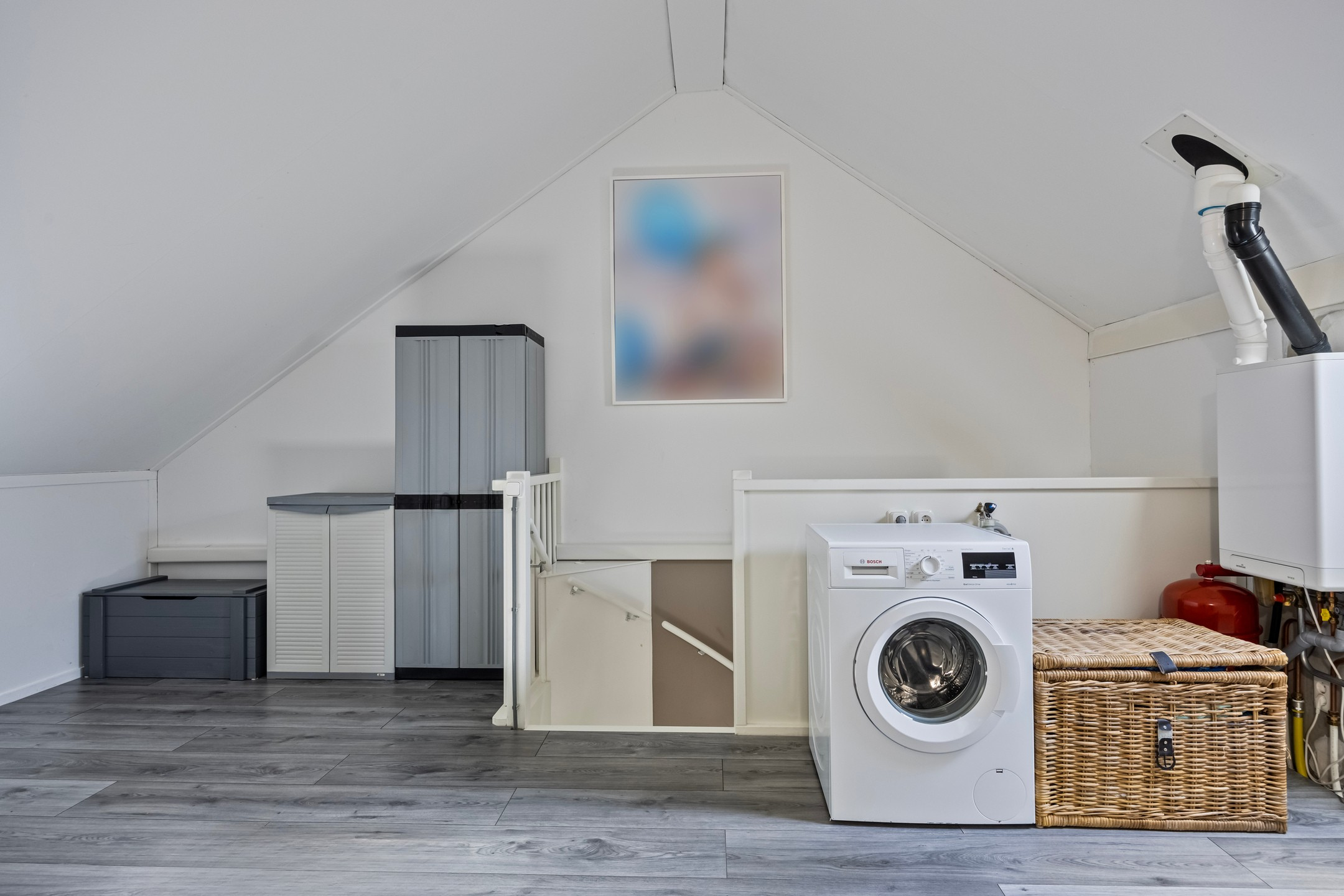 Tweede verdieping: via een vaste trap bereik je de royale zolder met dakraam. Hier vind je de witgoedaansluitingen, cv-installatie en veel bergruimte achter de knieschotten. Een extra slaapkamer of werkruimte realiseren? Dat kan hier moeiteloos!