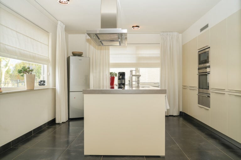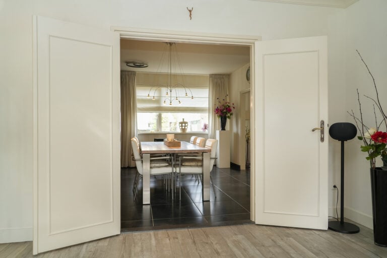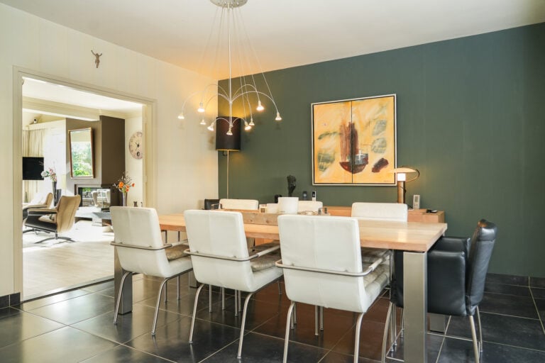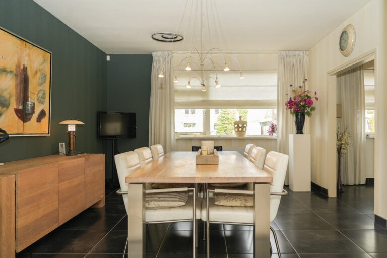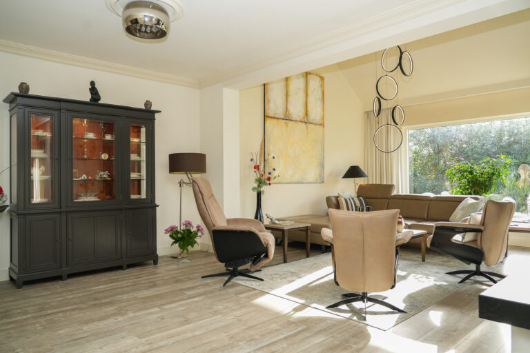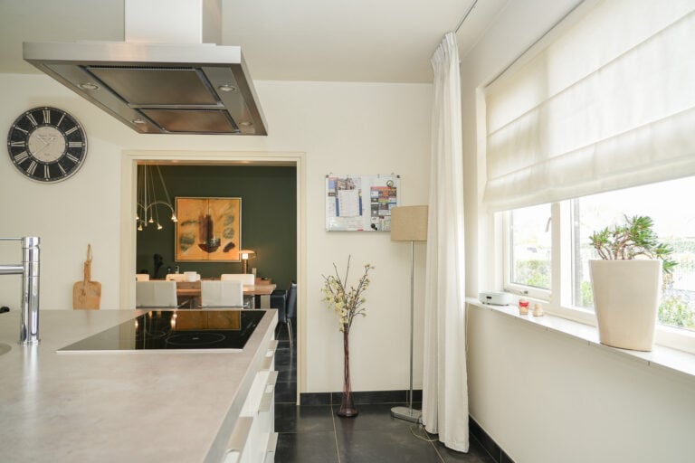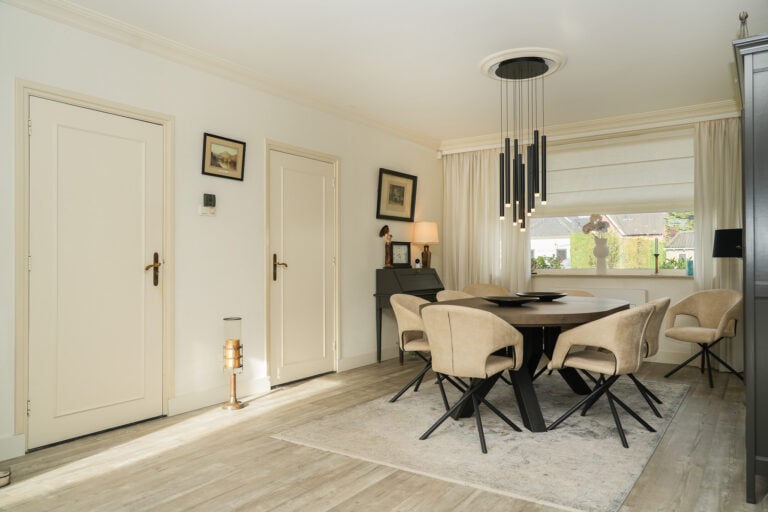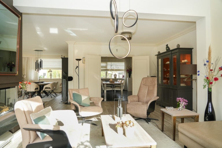 Op het ruime perceel van 958 m² ligt de villa mooi vrij, met een eigen oprit en uitrit. Via een van de twee entrees stap je binnen in een royale en uitnodigende leefruimte. De woonkamer van circa 60 m² heeft openslaande deuren naar de tuin en een elektrische haard die direct voor warmte en gezelligheid zorgt. Aansluitend ligt de eetkamer van ongeveer 20 m² met toegang tot de moderne keuken. Deze is uitgerust met een kookeiland, Quooker, inductiekookplaat, vaatwasser, koel-vriescombinatie en combioven een plek waar koken en samenzijn prettig samenkomen.