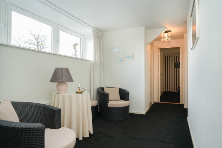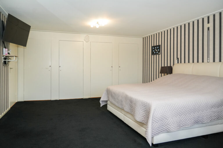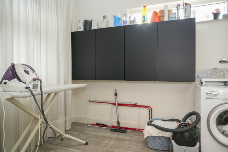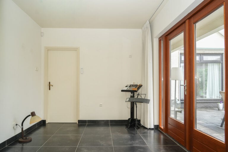 Op de begane grond vind je verder een praktische wasruimte, een toilet bij de achteringang en een extra kamer die zich perfect leent als kantoor of hobbyruimte, met openslaande deuren naar de tuin. Boven bevinden zich drie ruime slaapkamers, waarvan de master bedroom is voorzien van inbouwkasten en tv-aansluiting. De badkamer heeft een luxe uitstraling met een tweepersoons bad, ruime inloopdouche met regendouche en een wastafel. Ook hier is een separaat toilet aanwezig.