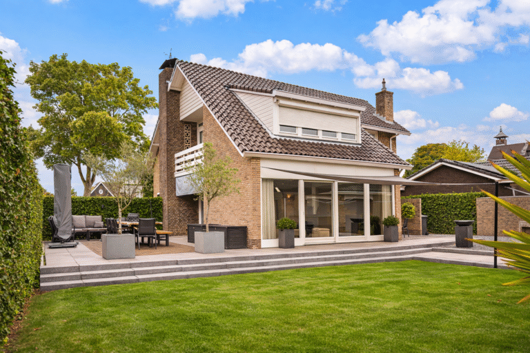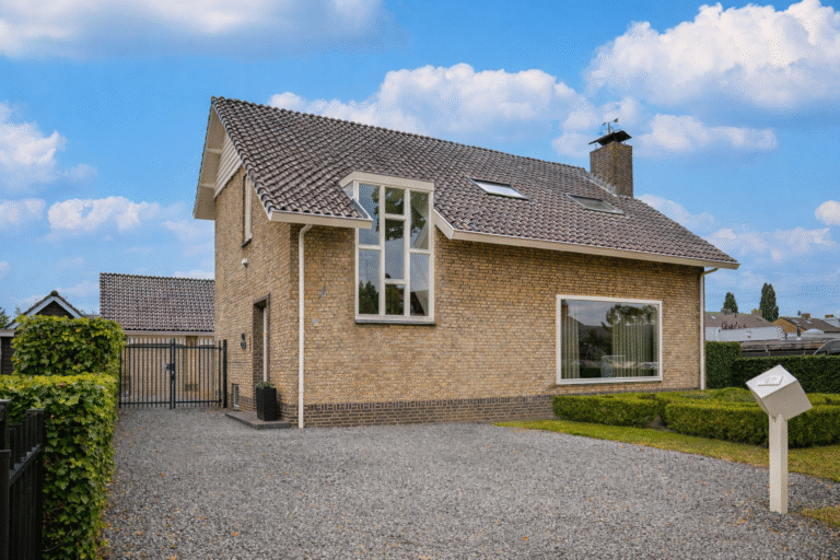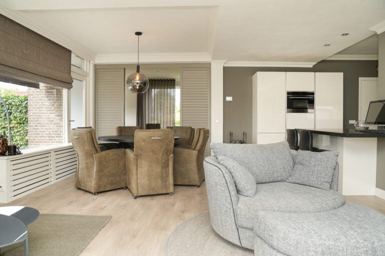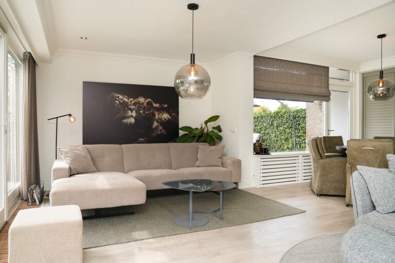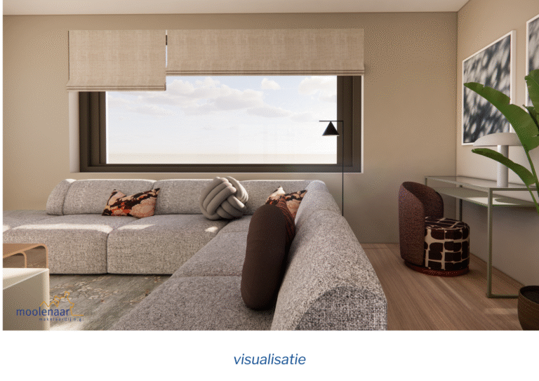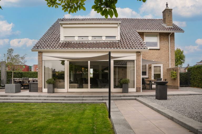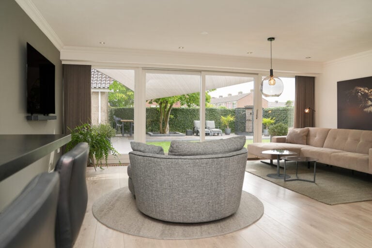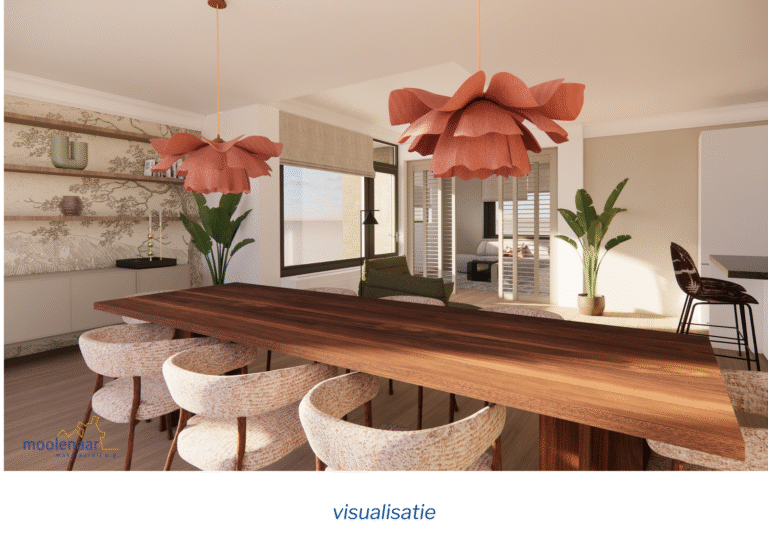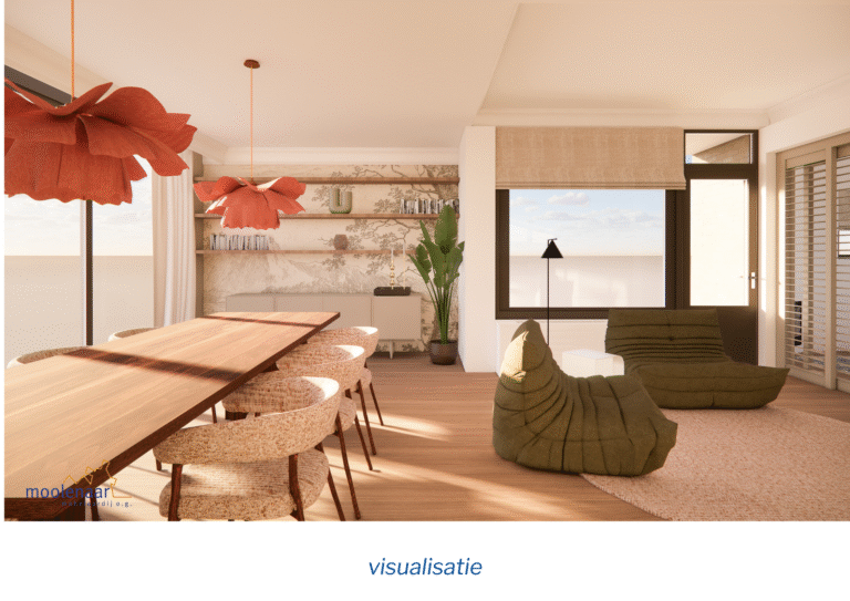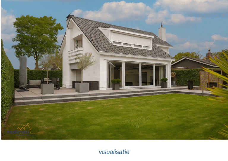 Naast de bestaande foto’s zijn er ook enkele visualisaties toegevoegd om de mogelijkheden van deze woning extra goed in beeld te brengen. Zo zijn er impressies van de woonkamer én van de achtergevel te zien. Op deze gevelvisualisaties kunt u zien hoe de woning eruit kan zien wanneer de gevel wit wordt uitgevoerd – een kleine aanpassing die de woning een frisse, moderne uitstraling geeft. Zo krijgt u niet alleen een goed beeld van de huidige indeling en sfeer, maar ook van het potentieel dat deze villa biedt.
