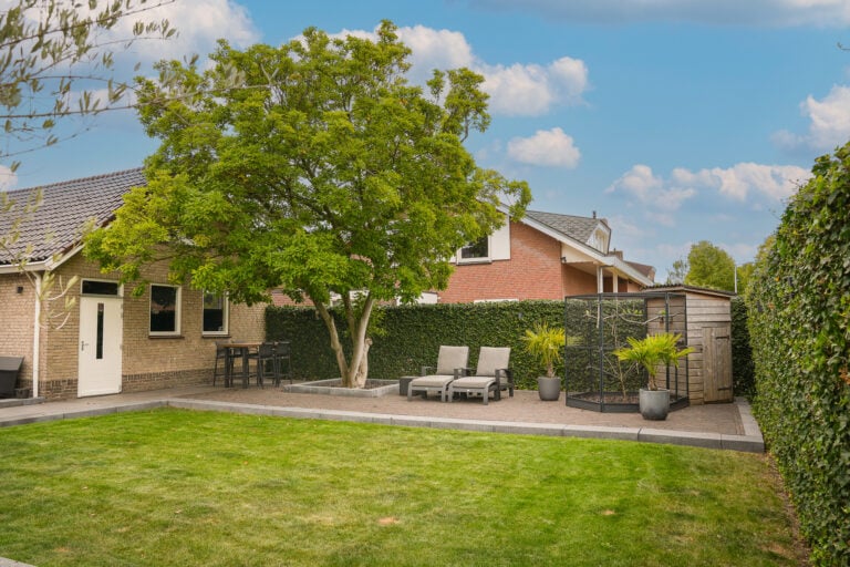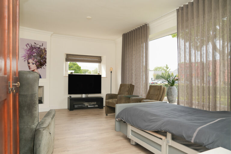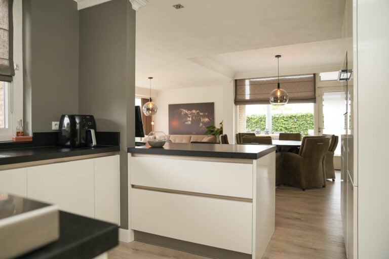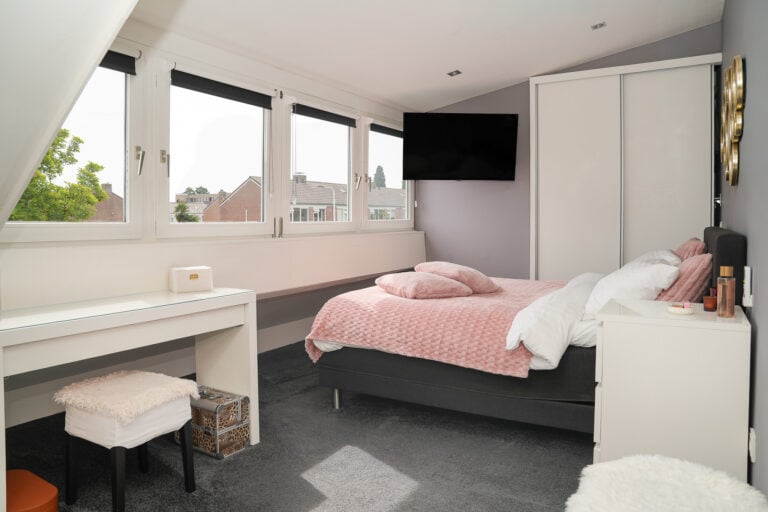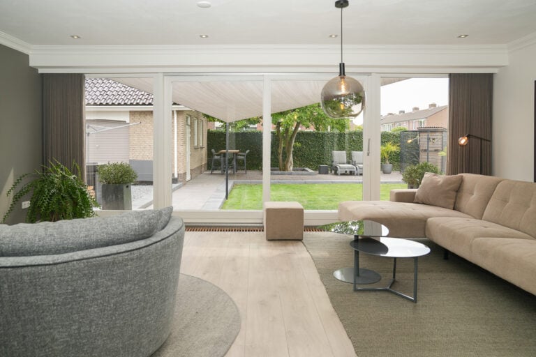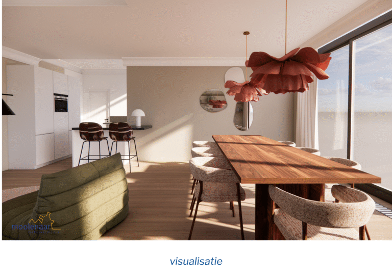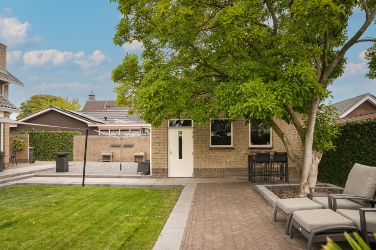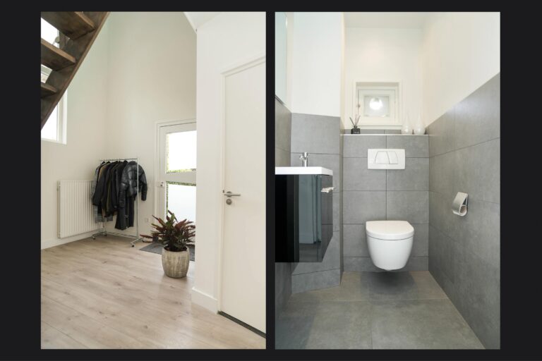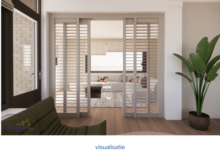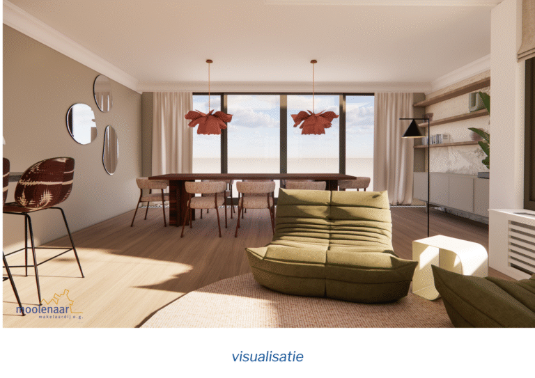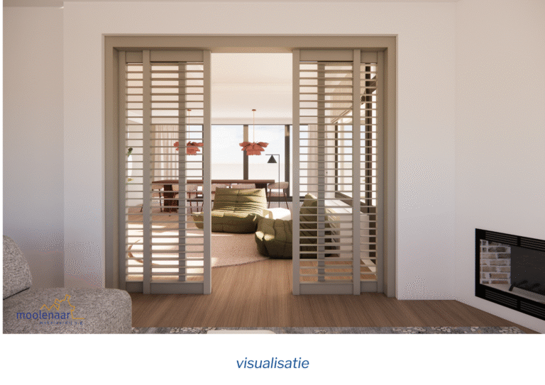 Naast de bestaande foto’s zijn er ook enkele visualisaties toegevoegd om de mogelijkheden van deze woning extra goed in beeld te brengen. Zo zijn er impressies van de woonkamer én van de achtergevel te zien. Op deze gevelvisualisaties kunt u zien hoe de woning eruit kan zien wanneer de gevel wit wordt uitgevoerd – een kleine aanpassing die de woning een frisse, moderne uitstraling geeft. Zo krijgt u niet alleen een goed beeld van de huidige indeling en sfeer, maar ook van het potentieel dat deze villa biedt.