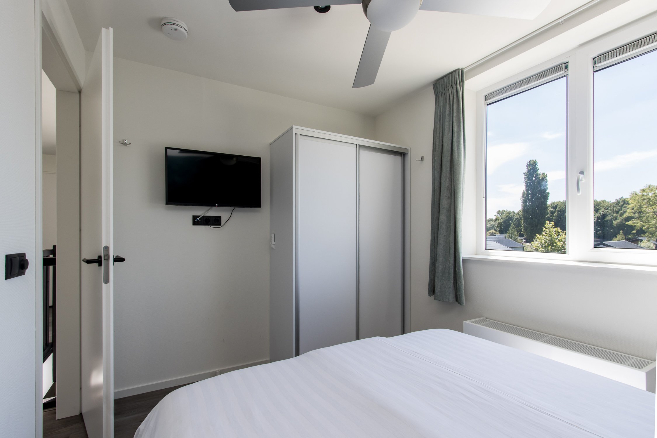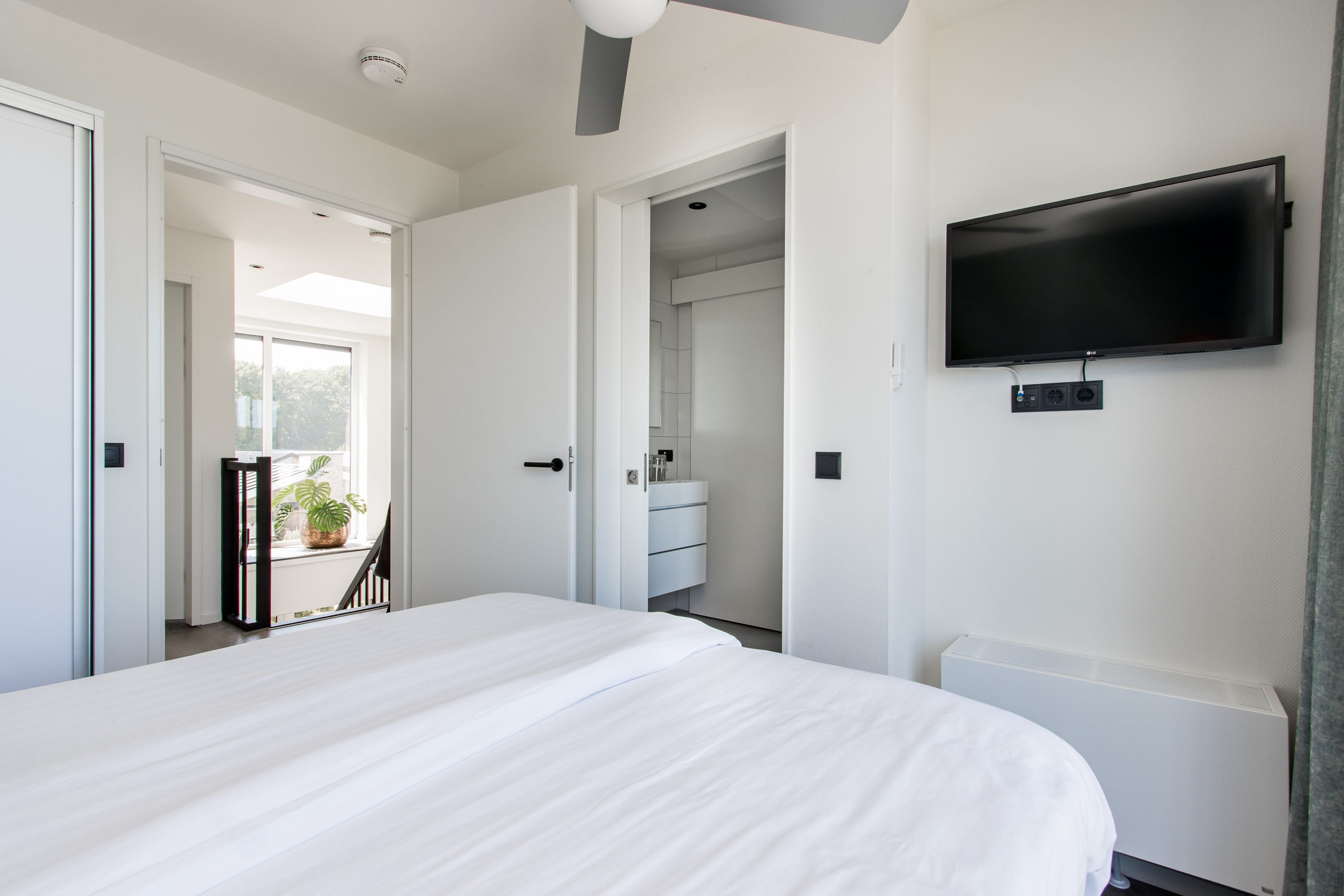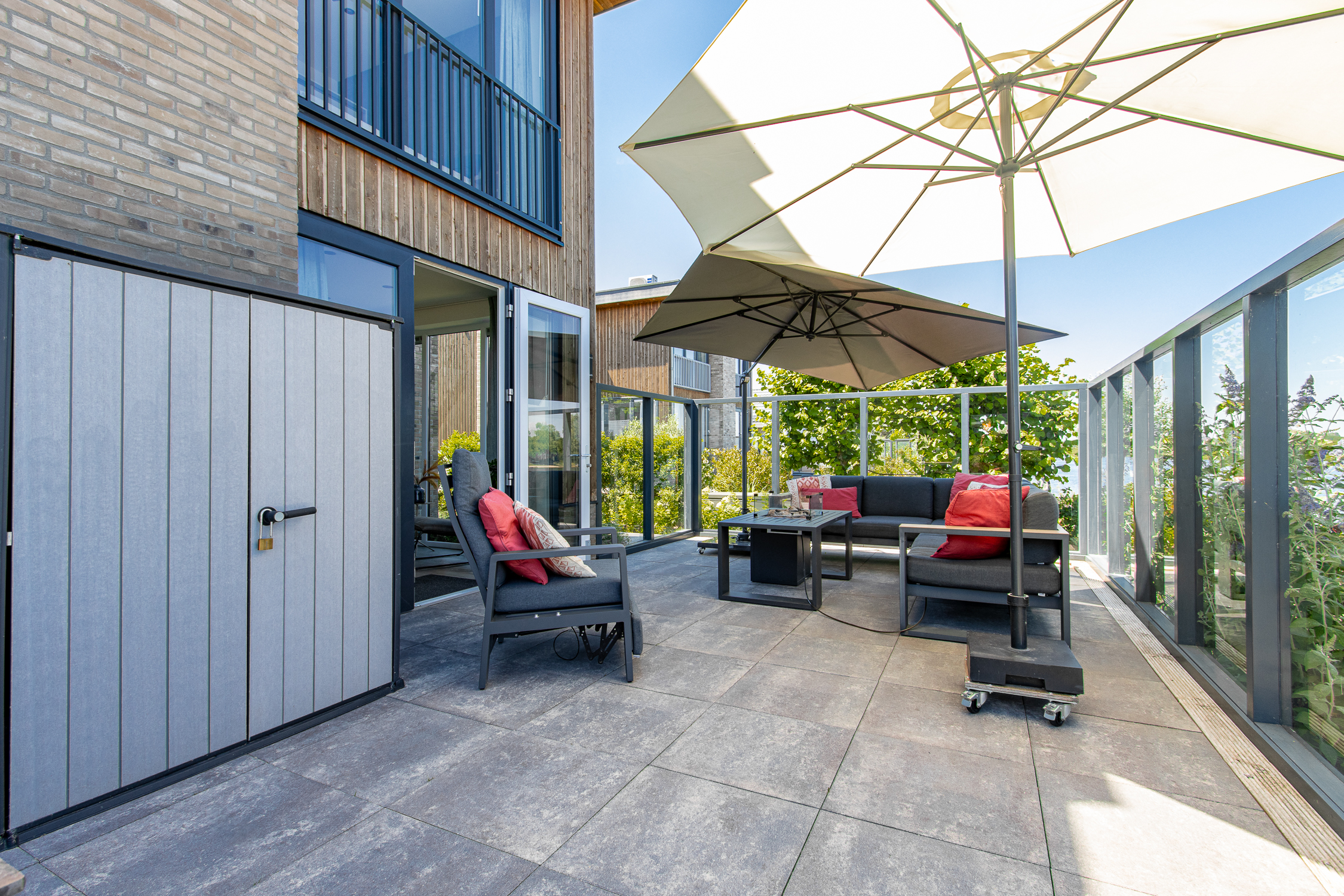 deuren naar terras inclusief grote raampartijen voor maximaal daglicht en uitzicht. Leuke extra is de ingebouwde elektrische haard.