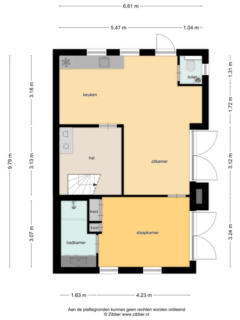Begane grond: via de entree stapt u direct de knusse woonkamer met open keuken binnen. Deze ruimte geeft toegang tot het toilet, slaapkamer met badkamer en de hal met witgoedaansluiting en trapopgang naar de verdieping. Zowel de woon- als de slaapkamer zijn voorzien van openslaande deuren.