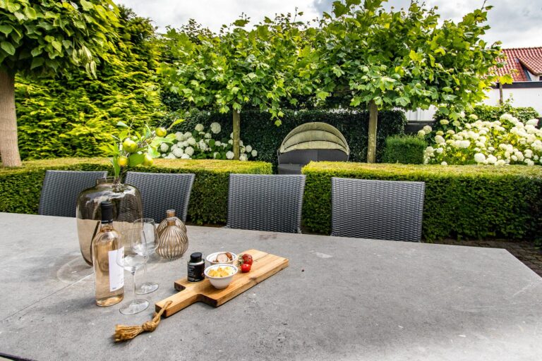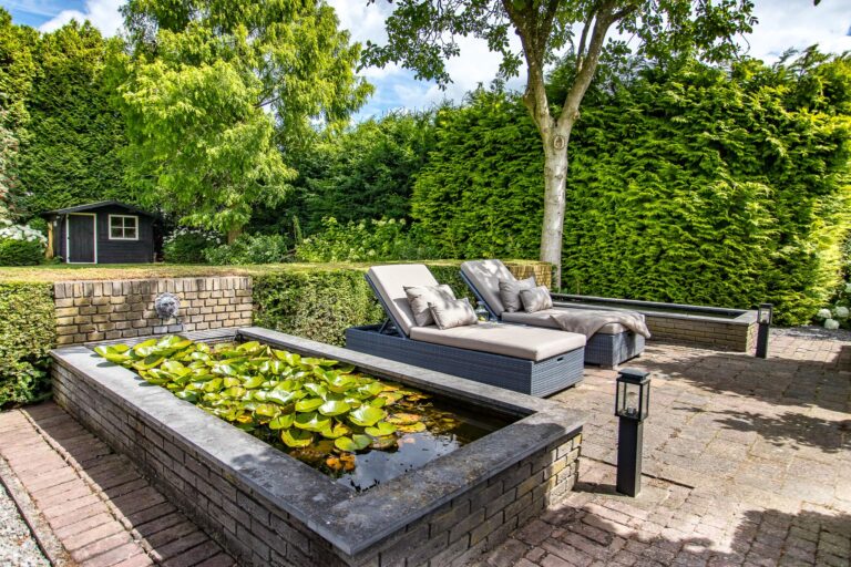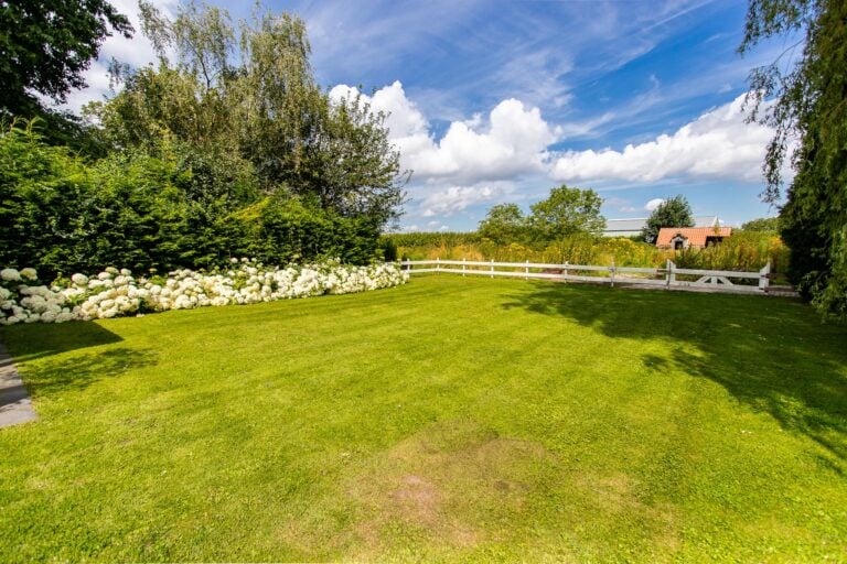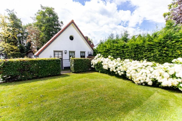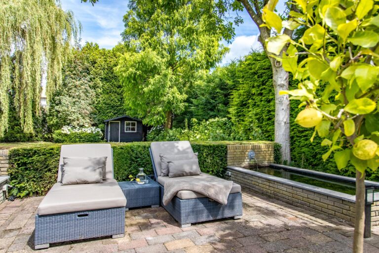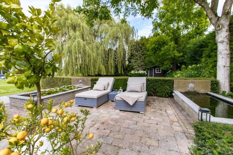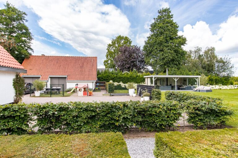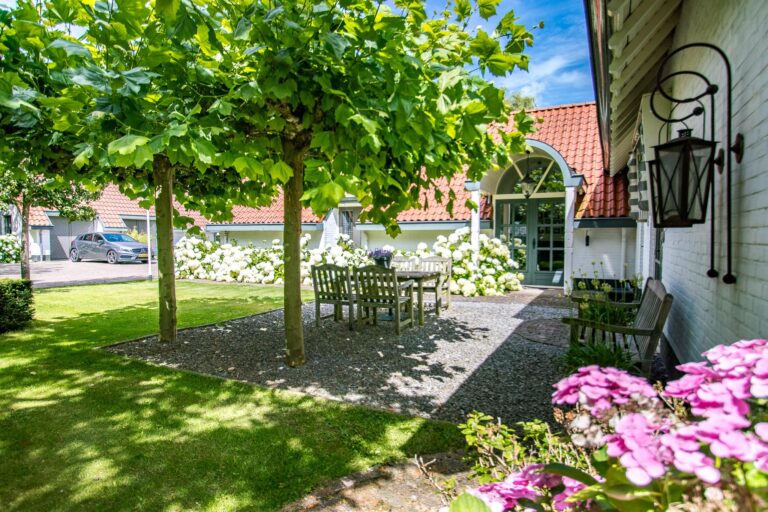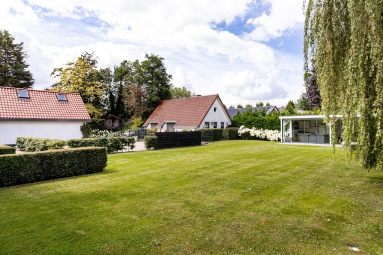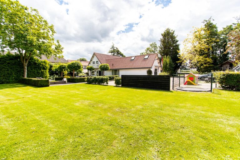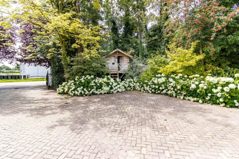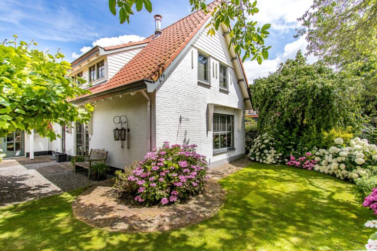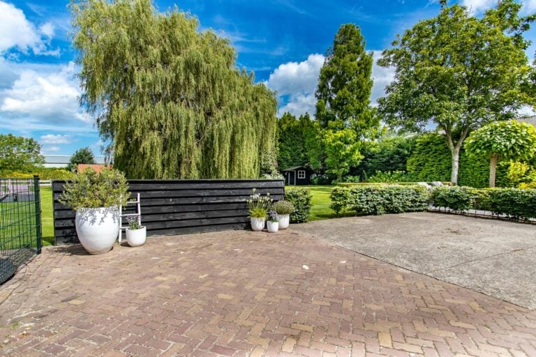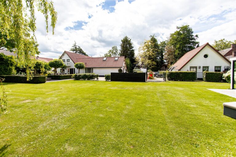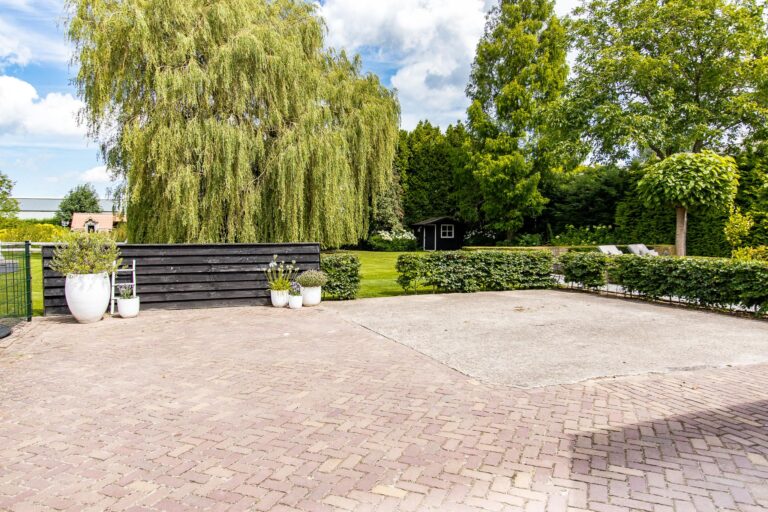 De tuin rondom de woning is verzorgd aangelegd met o.a. siergrind, gazon, verschillende struikgewassen, plantenborders en terrassen. De afsluitbare oprit aan de voorzijde van de woning biedt volop plek voor het parkeren van meerdere voertuigen. Met een uitgestrekt perceel, compleet met een weelderig gazon en sfeervolle terrassen, is er voldoende ruimte om in alle seizoenen te genieten van het buitenleven.