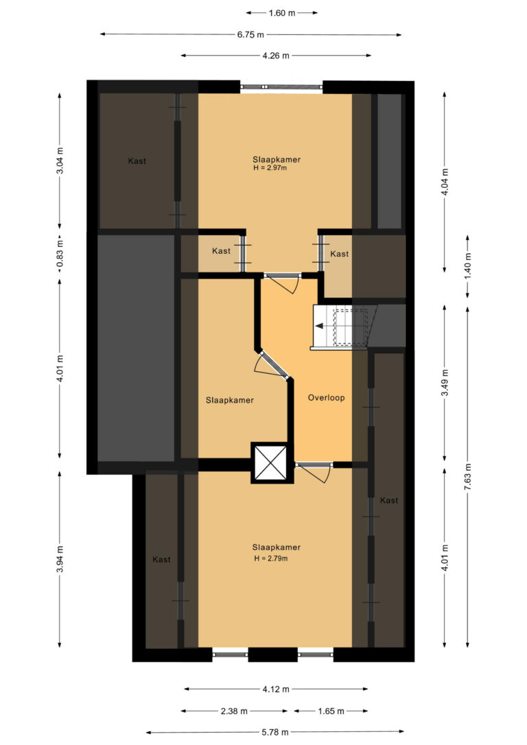 Eerste verdieping: de overloop met vaste kastruimte geeft toegang tot 3 slaapkamers.