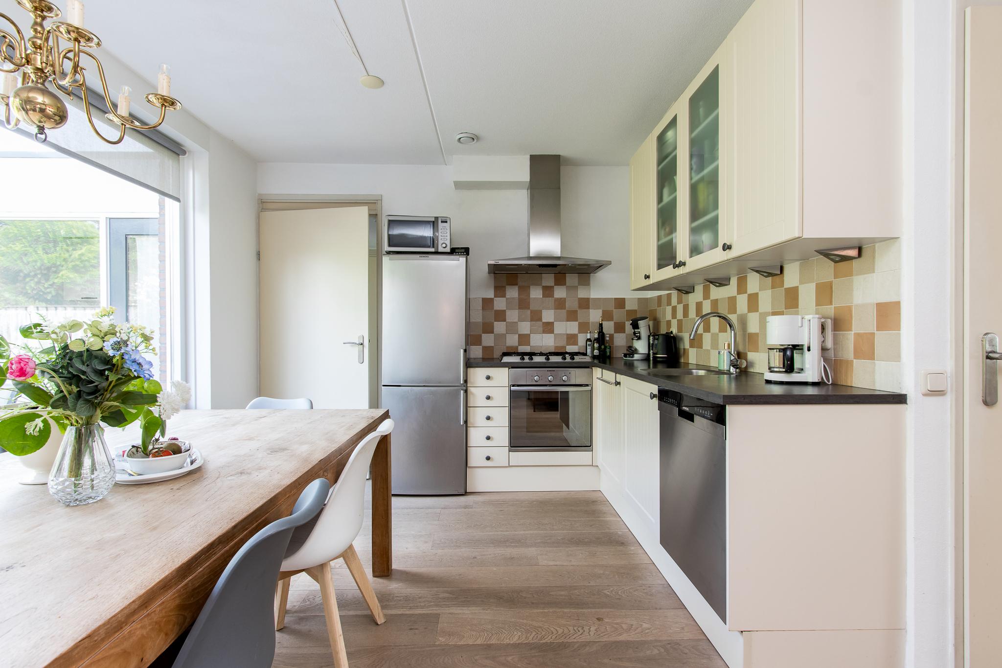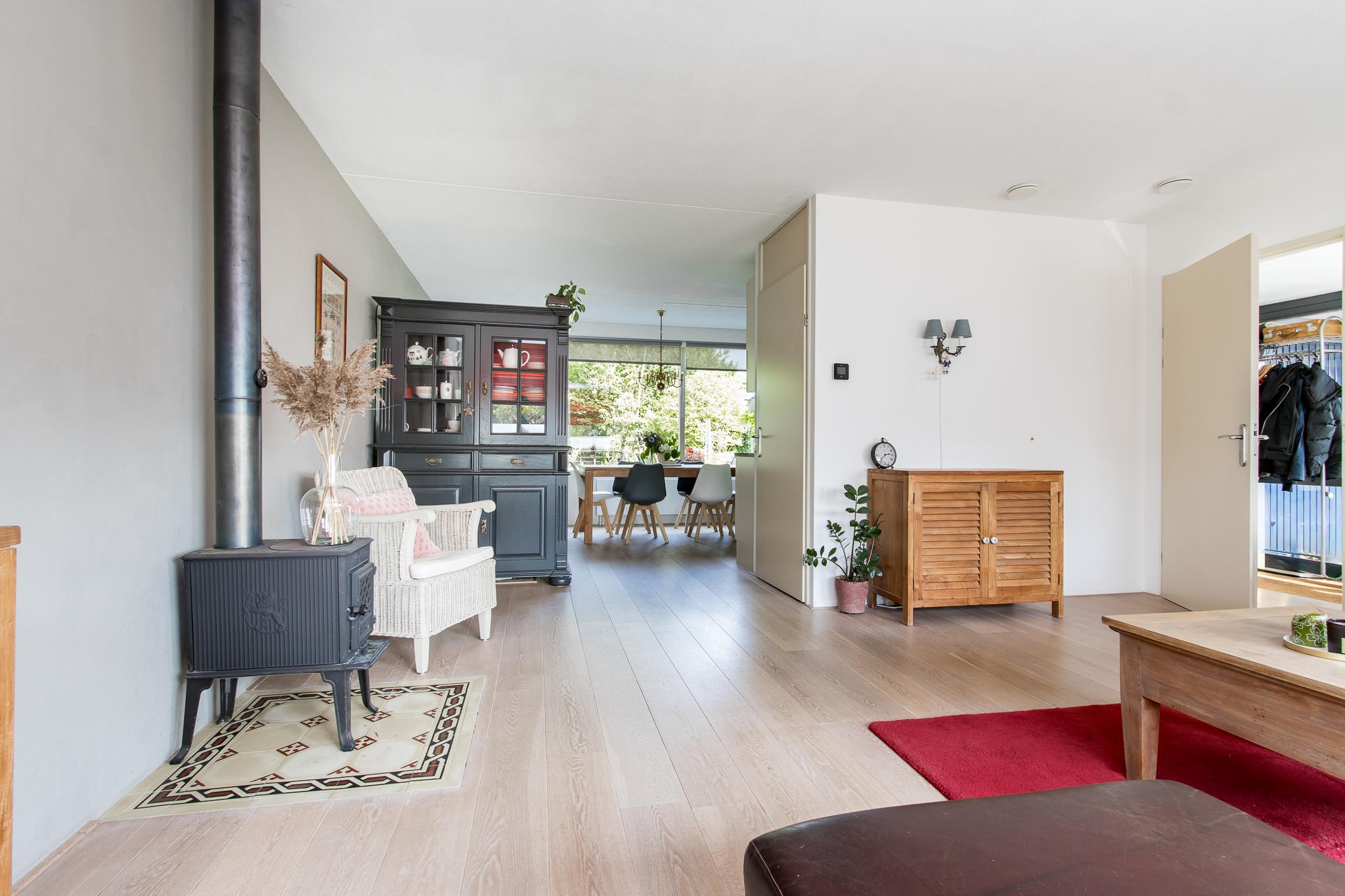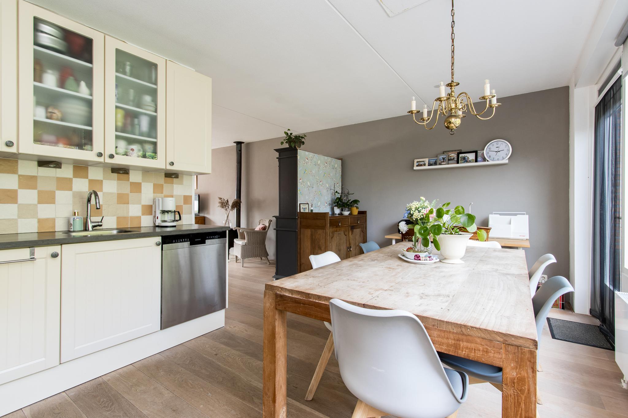 Indeling woonhuis: via de overdekte entree bereikt u de ruime hal met garderobe, meterkast, toiletruimte en trapopgang naar de eerste verdieping. Vanuit de hal is de sfeervolle woonkamer te bereiken, die in open verbinding staat met de keuken aan de achterzijde. De keuken in hoekopstelling is voorzien van diverse inbouwapparatuur, zoals; 5-pits kookplaat, afzuigkap, oven en koelkast. Aangrenzend bevindt zich de bijkeuken met aansluitingen voor het witgoed. Vanuit de bijkeuken is de achtertuin en de garage bereikbaar.