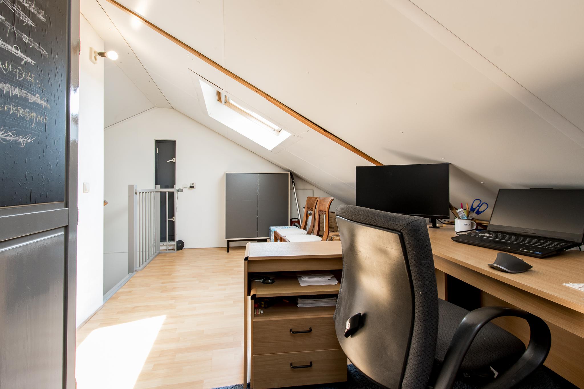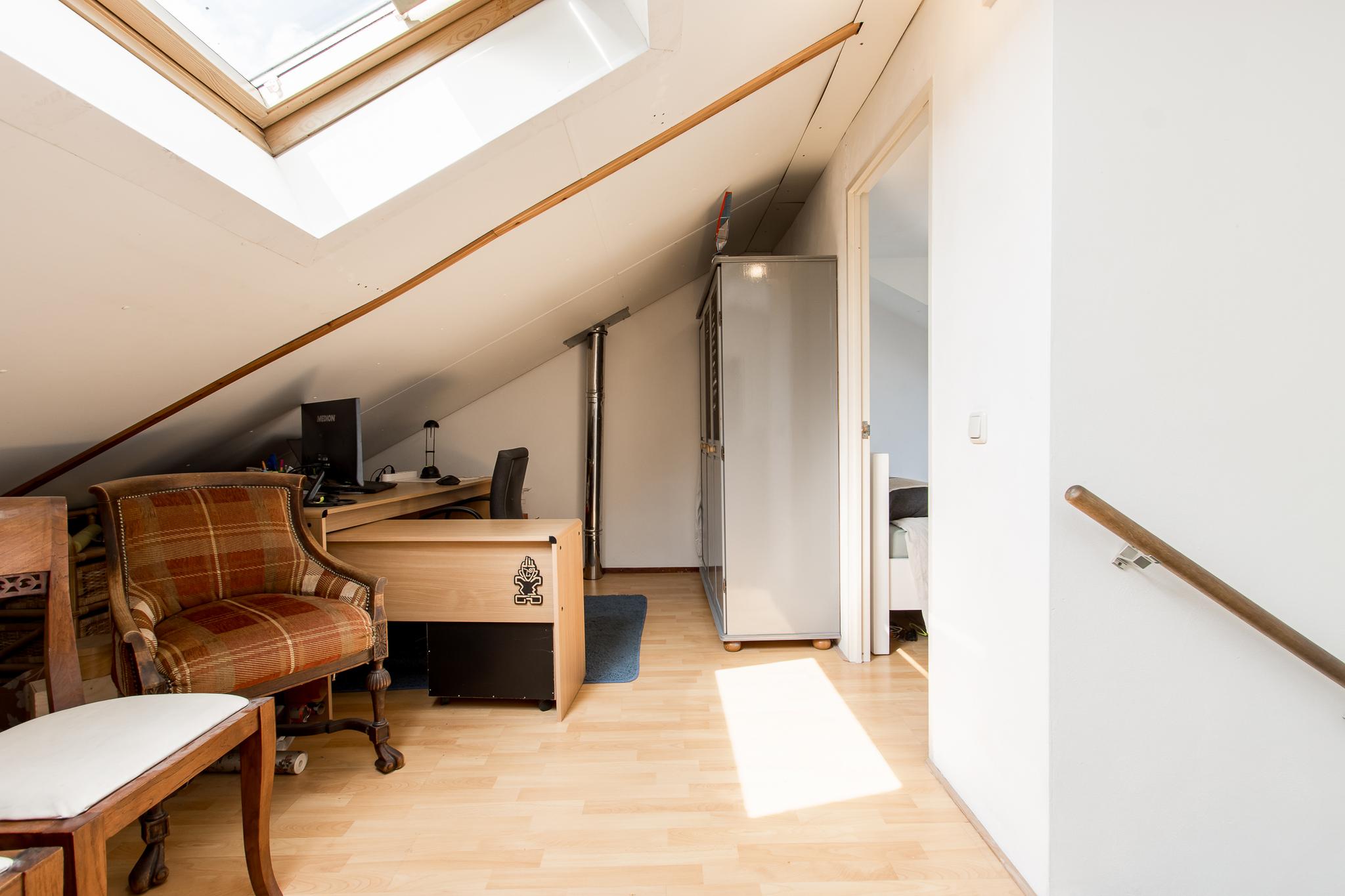 Tweede verdieping: een vaste trap geeft toegang tot de ruime overloop voorzien van dakvenster. Via de overloop bereikt u de 3e slaapkamer met dakkapel voor extra ruimte en licht.