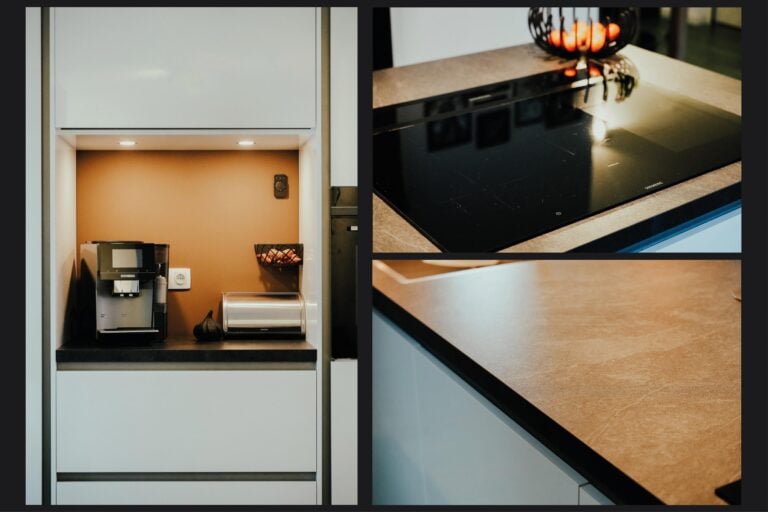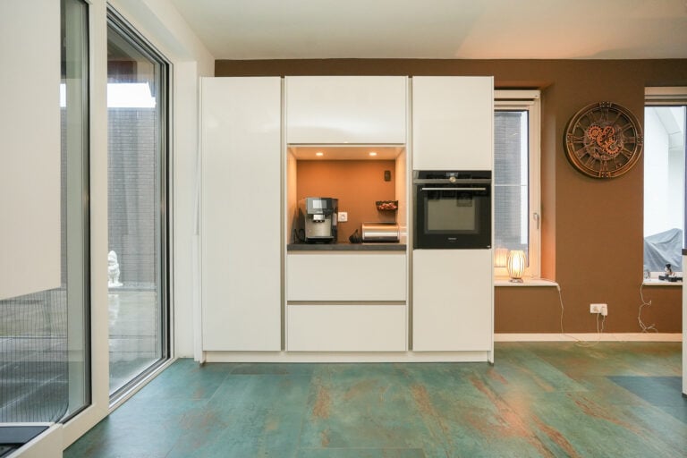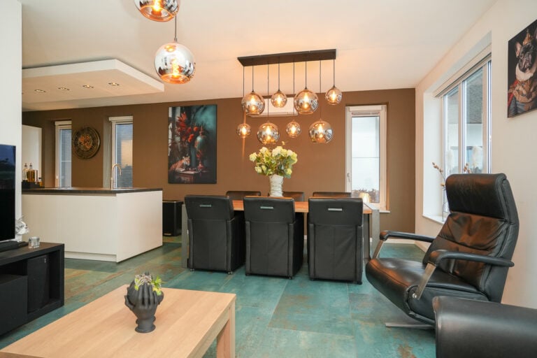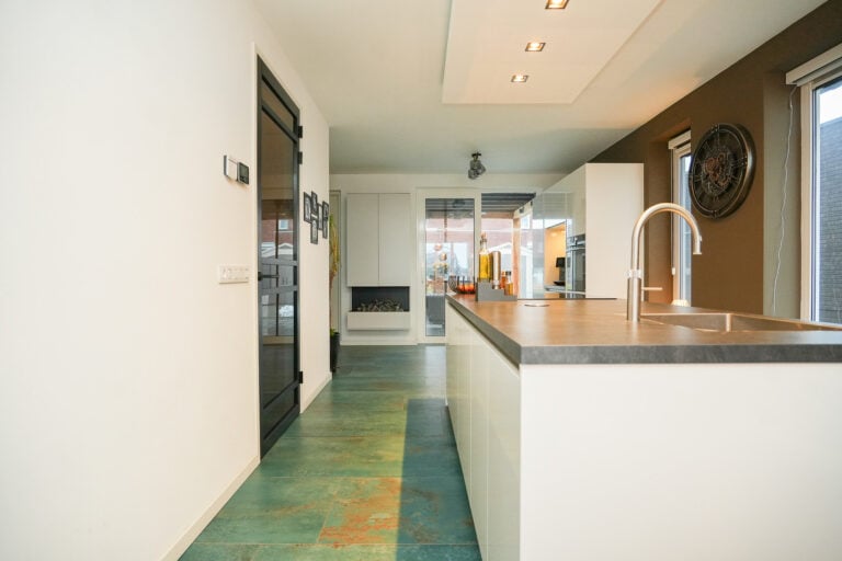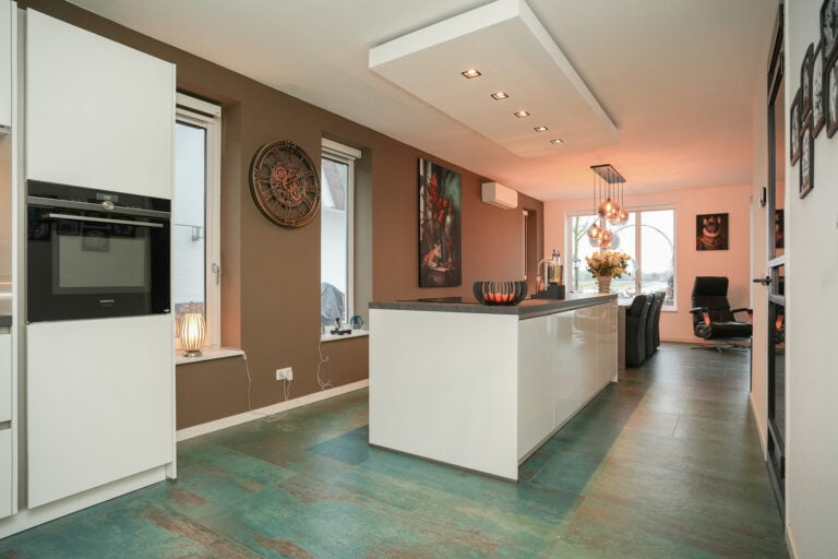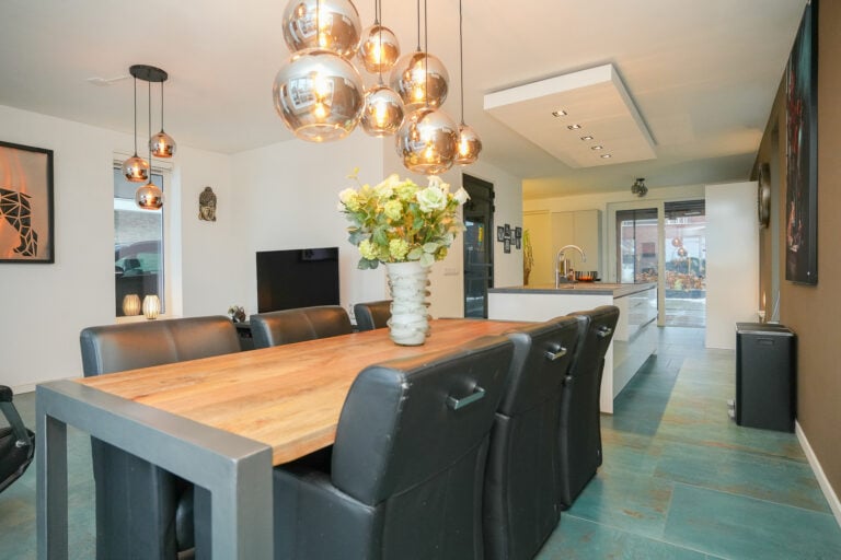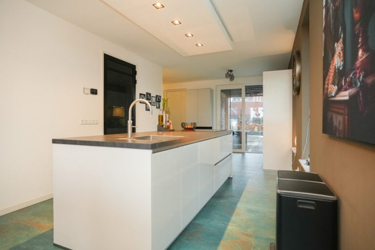 De keuken is strak en eigentijds uitgevoerd en voorzien van een kook- en spoeleiland en een vaste kastenwand met een stijlvolle koffienis. Uiteraard is de keuken uitgerust met diverse inbouwapparatuur, waaronder een inductiekookplaat, afzuigkap, magnetron, combi-oven, vaatwasser, koelkast en een Quooker. Via de schuifpui is er directe toegang tot de sfeervolle overkapping, waardoor binnen en buiten naadloos in elkaar overlopen.