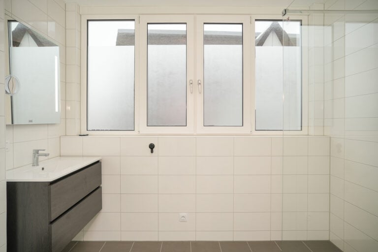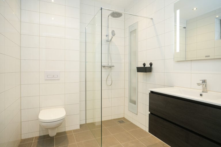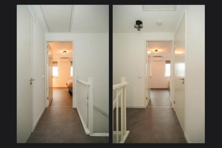 Eerste verdieping: de overloop leidt naar twee slaapkamers en een tweede badkamer. Deze badkamer is compleet uitgevoerd met een inloopdouche, wandcloset, badkamermeubel en vloerverwarming.