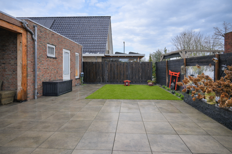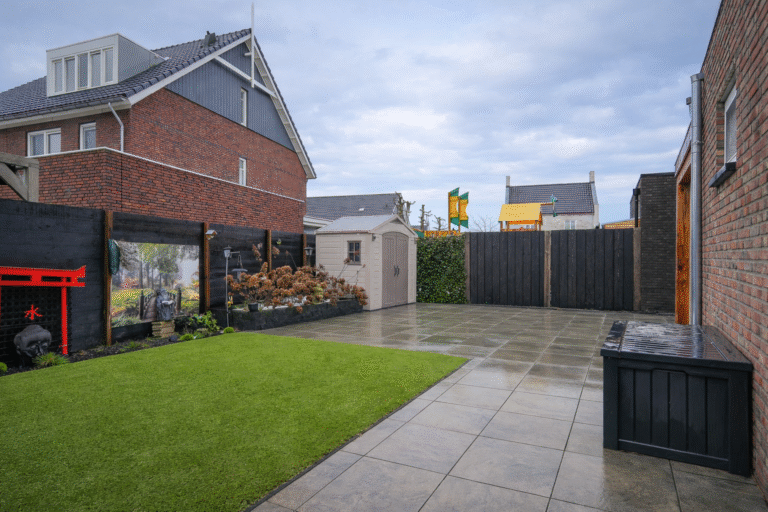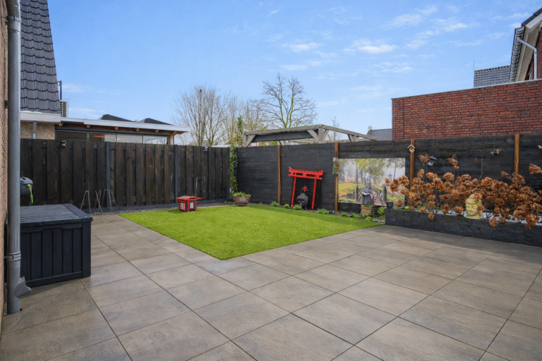 De voortuin en oprit zijn volledig bestraat en daardoor onderhoudsvriendelijk. De achtertuin ligt gunstig op het zuiden en is strak en verzorgd aangelegd met moderne terrastegels, een kunstgazon, plantenborders en een nette schutting. Ook de ruime overkapping maakt het mogelijk om hier vrijwel het hele jaar door van het buitenleven te genieten.