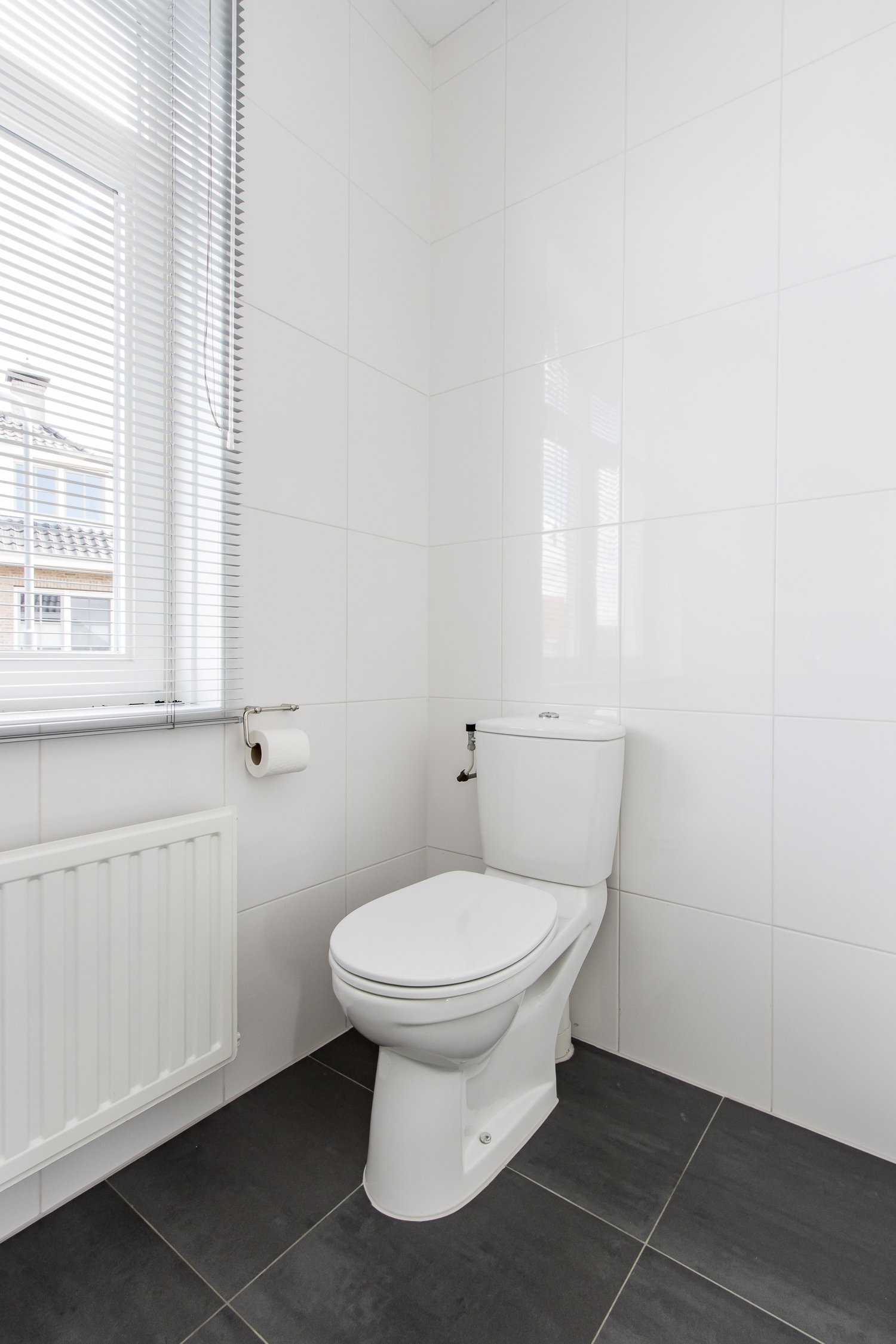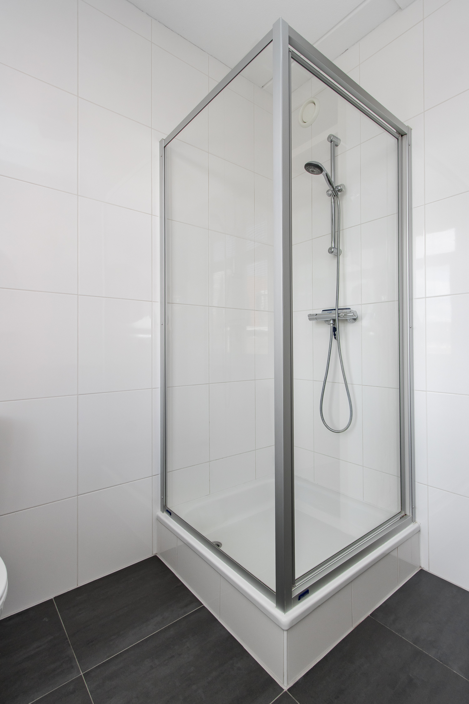 Eerste verdieping: de overloop leidt naar drie slaapkamers en nette badkamer met douche, toilet en wastafel.