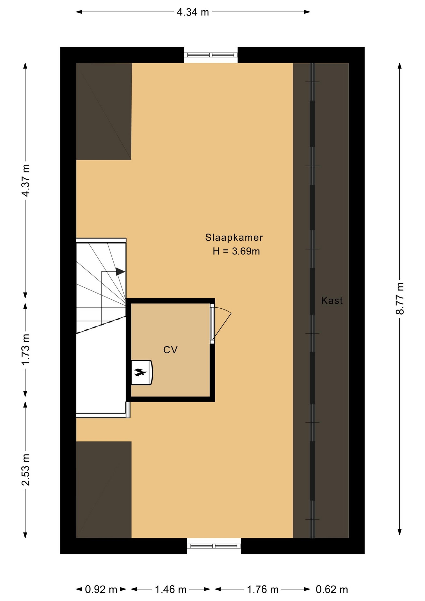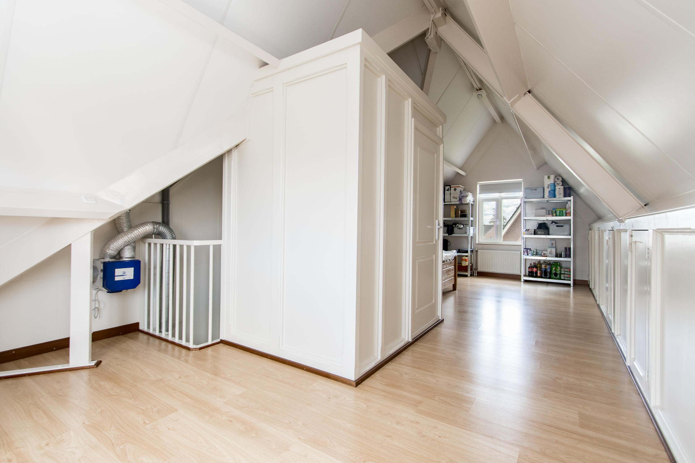 Tweede verdieping: een vaste trap geeft toegang tot de royale open zolder waar zich de vierde slaapkamer bevindt. De ruimte is voorzien van bergschotten en een aparte berging voor de CV installatie.
