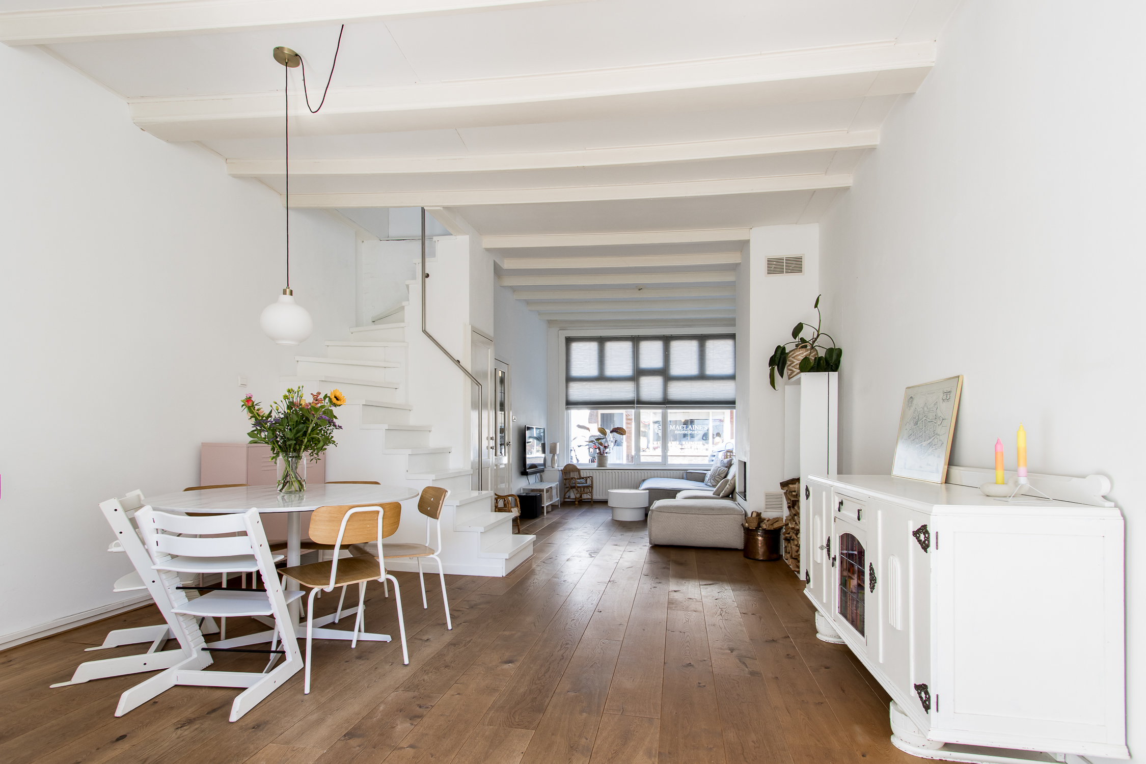 • in de woonkamer ligt een fraaie vloer met brede, eiken delen;
